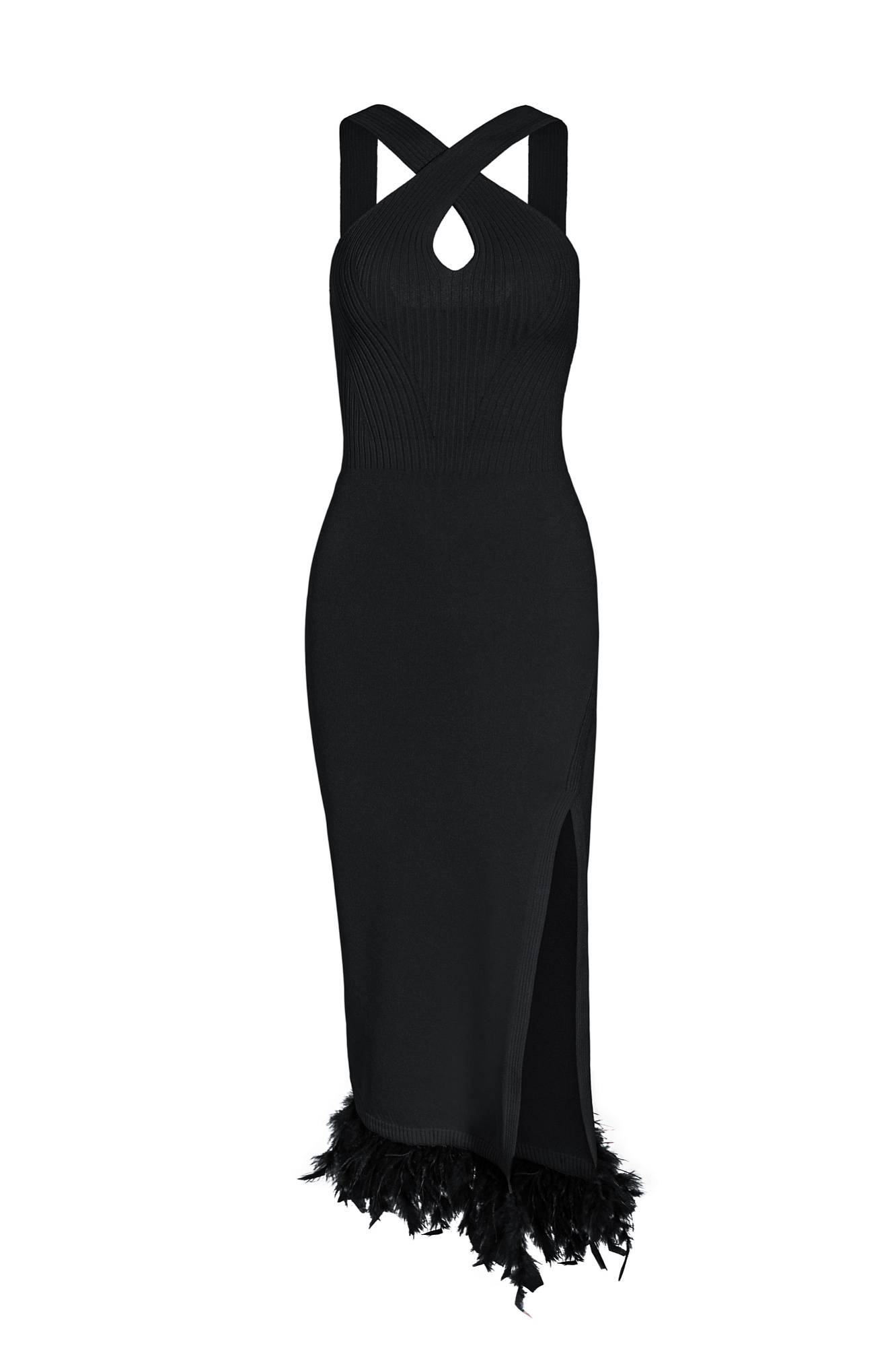 Трикотажное платье, декорированное перьями. Модель приталенного силуэта с открытой спиной, перекрученным лифом и разрезом сбоку.