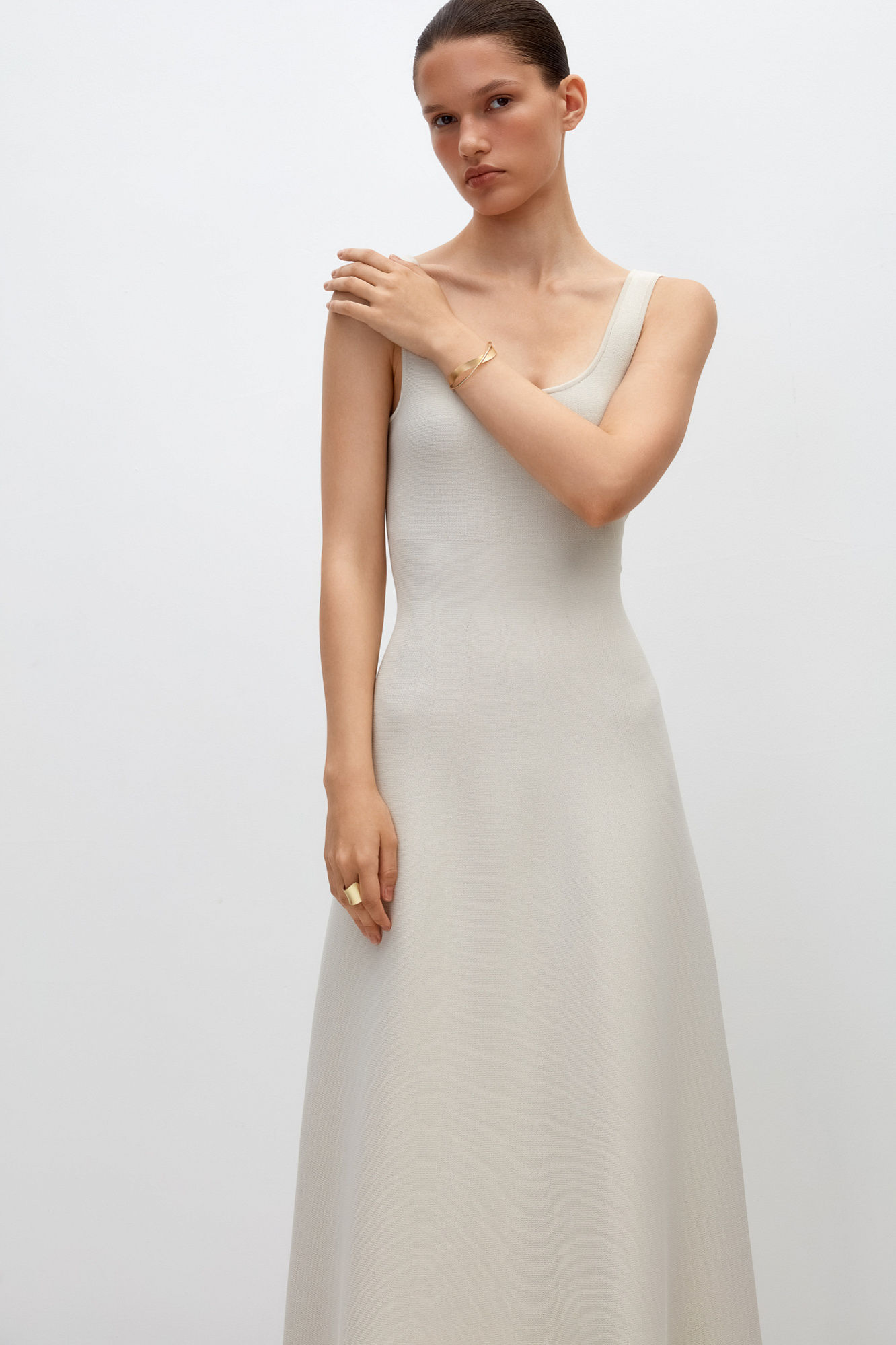 Трикотажное платье длины миди из плотной вискозы. Модель без рукавов, на широких бретелях и юбкой А-силуэта. Застежка на молнию сзади.