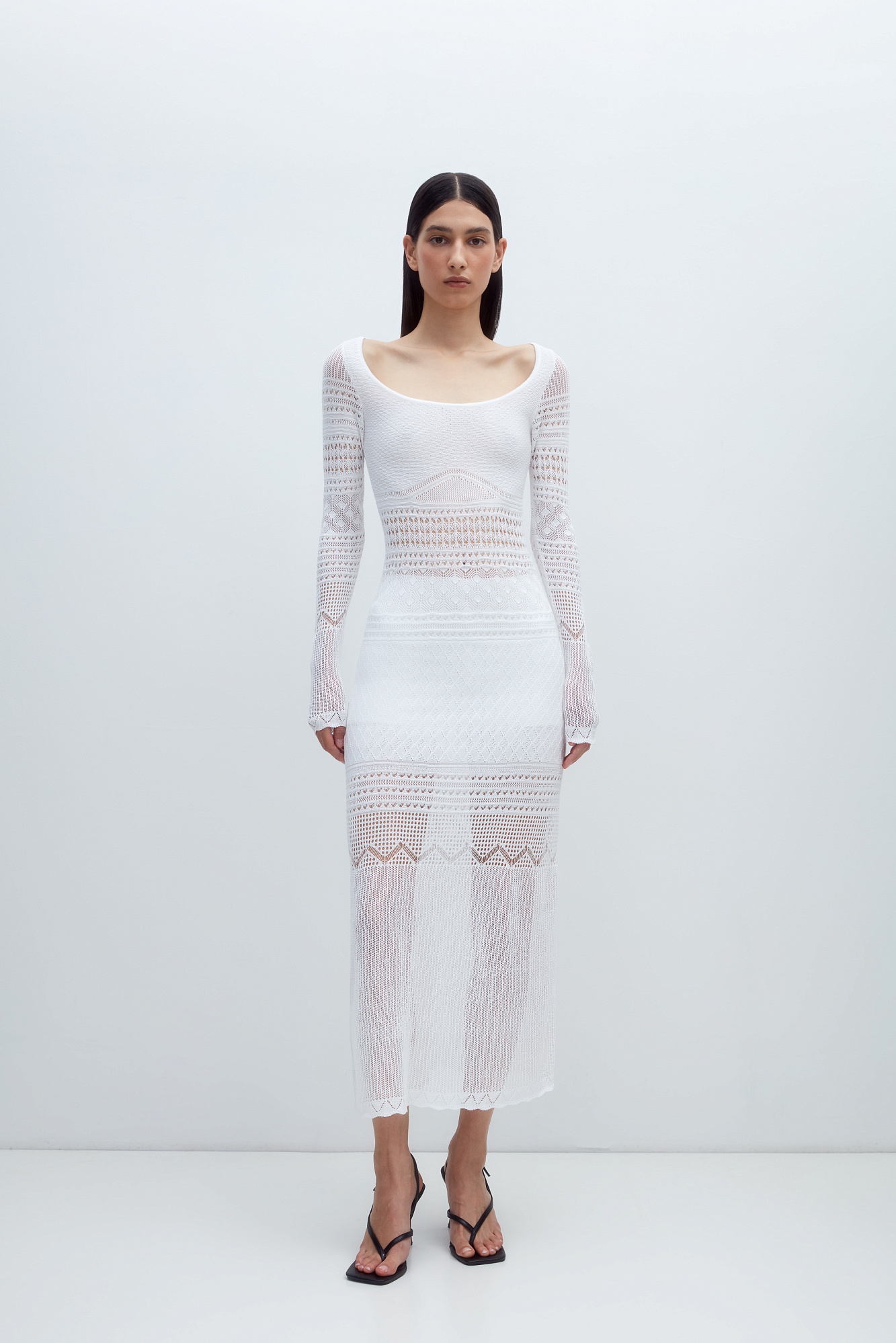 Трикотажное ажурное платье с геометрическими узорами длины миди. Модель с глубоким вырезом лодочкой, открывающим линию ключиц и длинными рукавами.