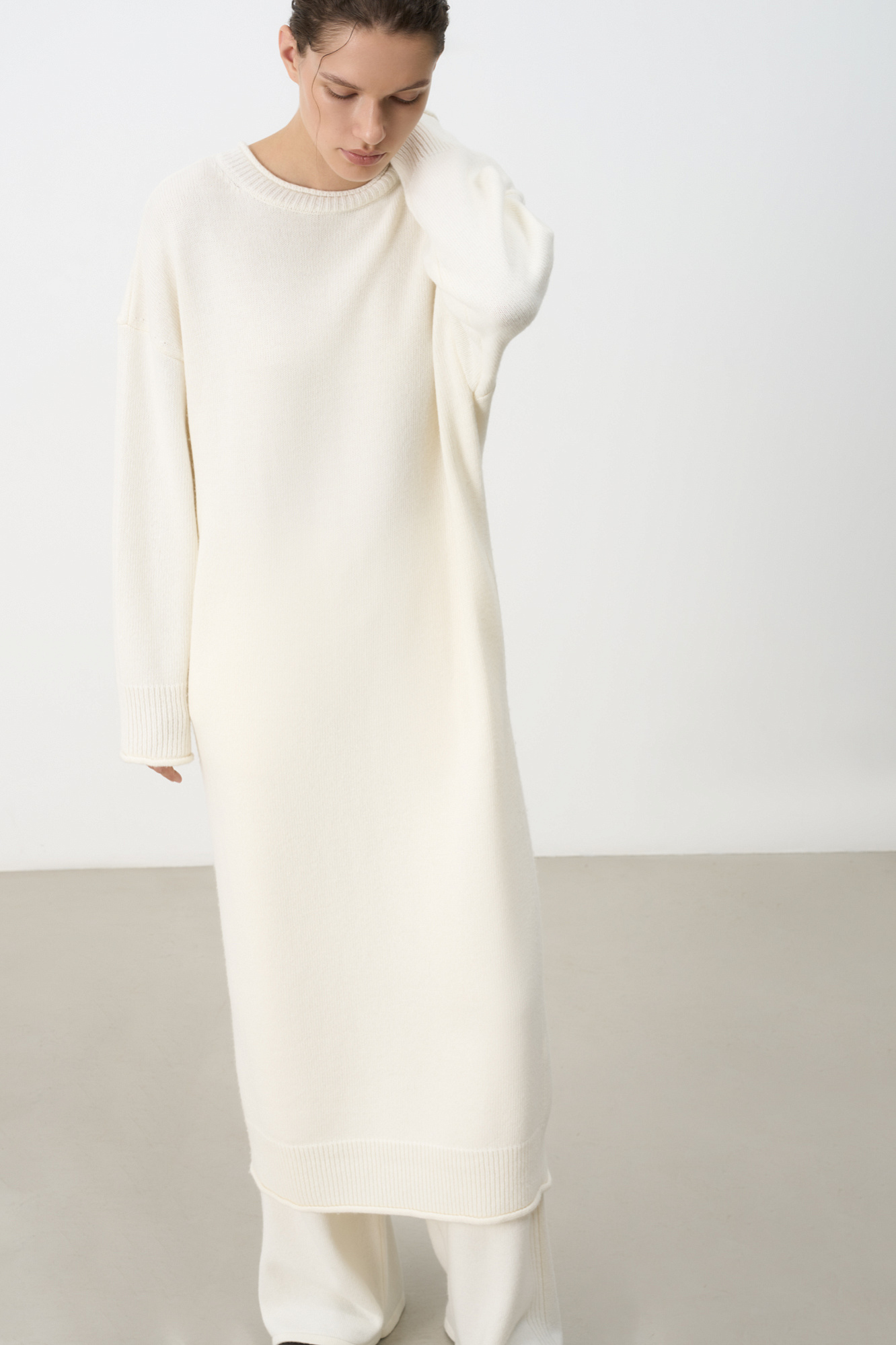 Трикотажное платье длины макси из смесовой шерсти с добавлением кашемира. Модель свободного силуэта со спущенной линией плеча и карманами. Края изделия выполнены в рубчик. Брендированный ярлык на спине.