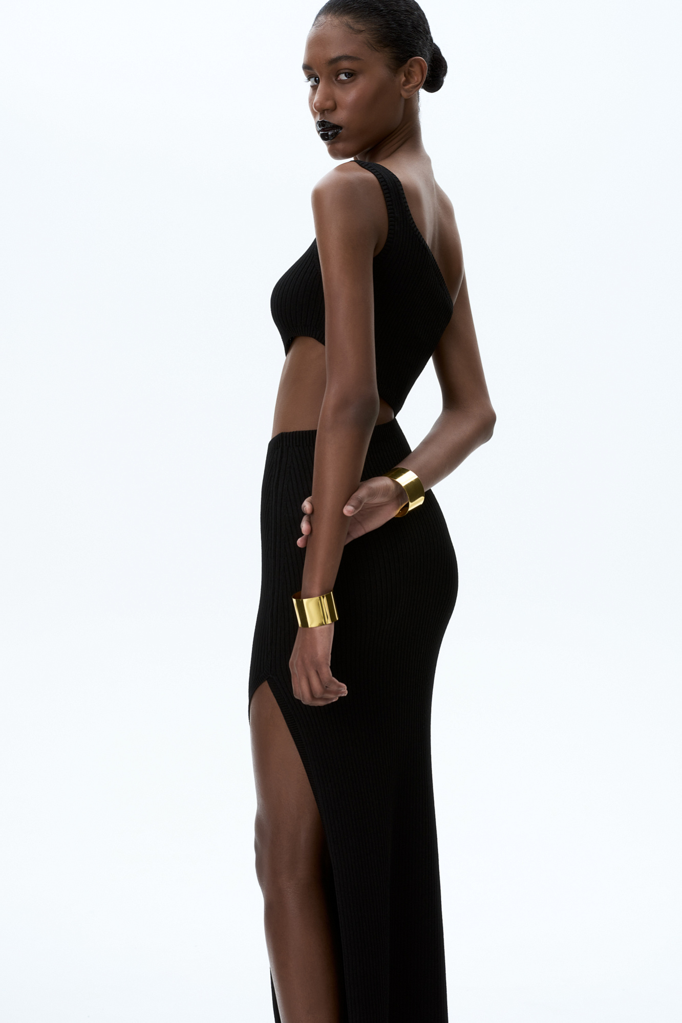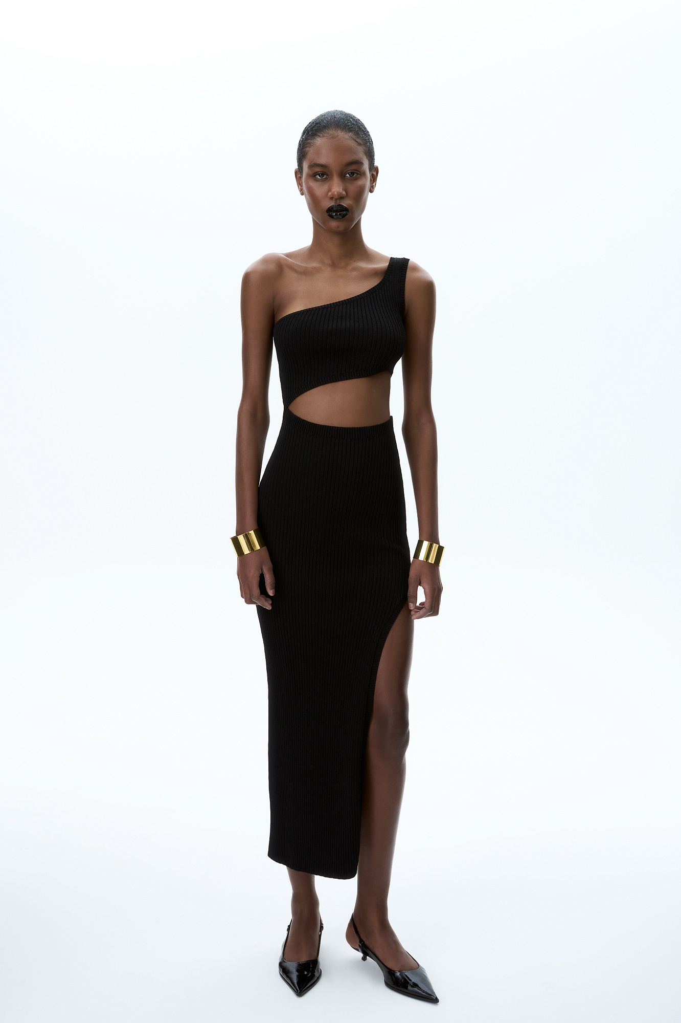 Трикотажное платье длины миди из вискозы в рубчик. Модель приталенного силуэта асимметричного кроя, с акцентным вырезом на талии, высоким разрезом на бедре и широкой бретелькой на одно плечо.