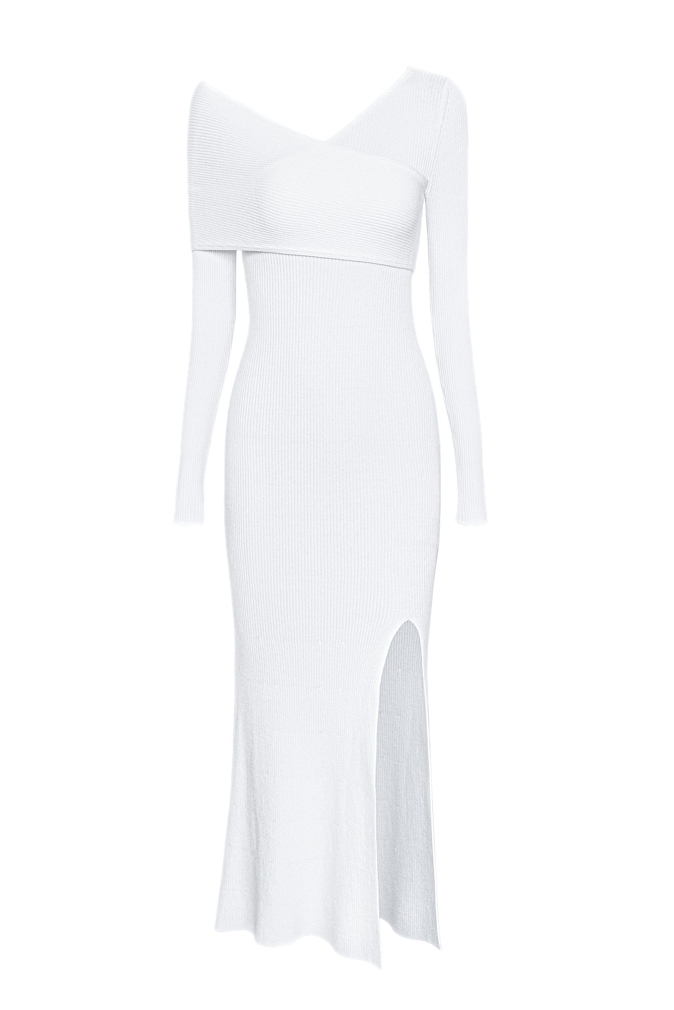 Трикотажное платье длины миди из вискозы. Модель облегающего силуэта, с асимметричным вырезом, длинными рукавами и высоким разрезом на бедре. Платье выполнено в рубчик. Вырез горловины и лиф изделия декорирован отлетной деталью и открытым плечом.