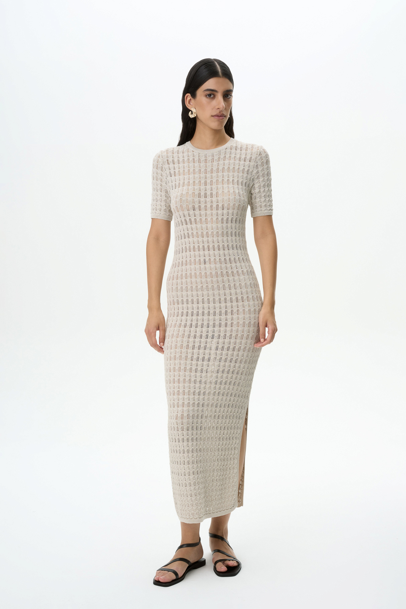 Трикотажное платье с коротким рукавом. Модель приталенного силуэта длины макси, выполнена полностью ажурным переплетением.