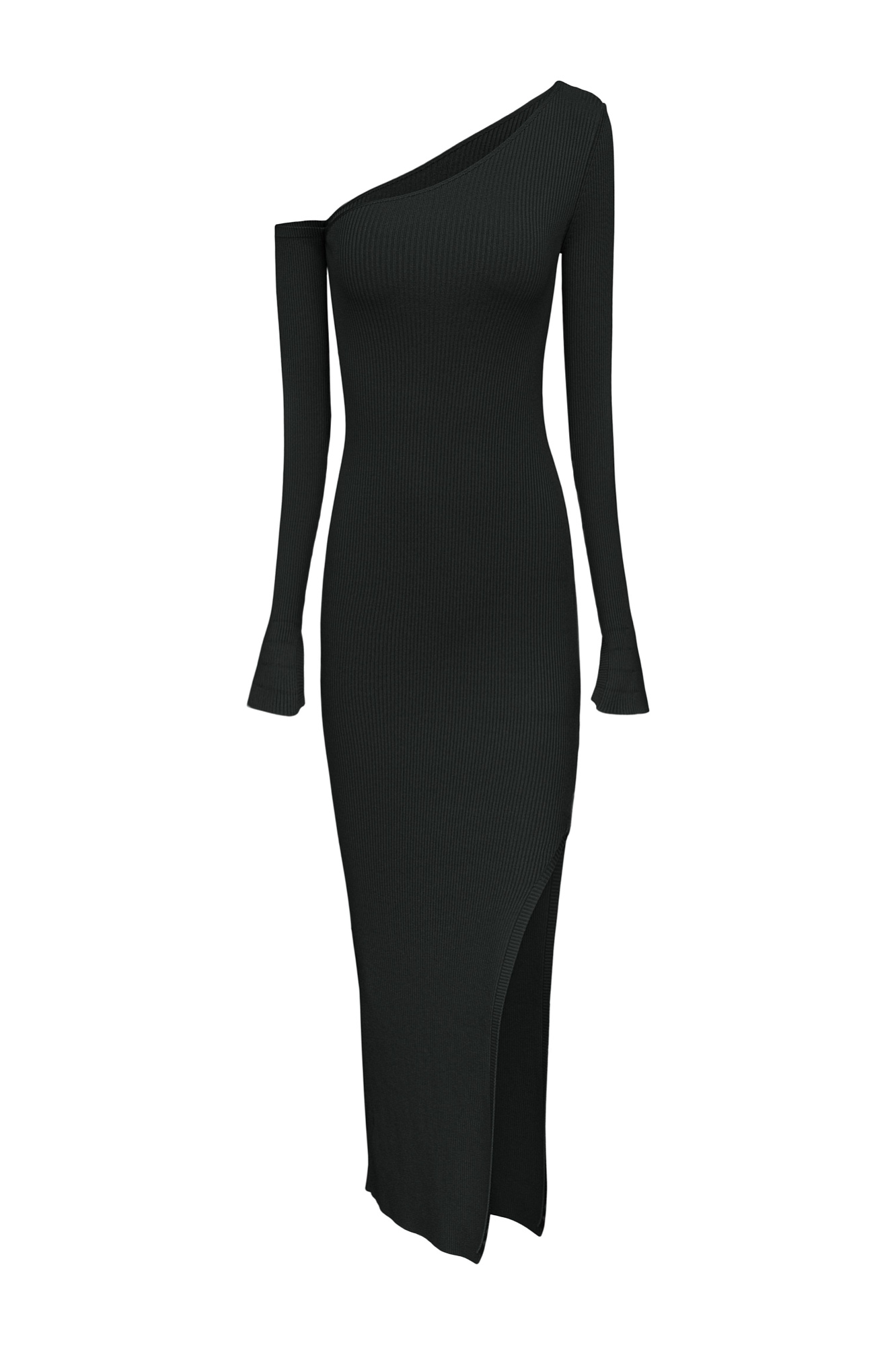Трикотажное платье длины миди из вискозы в рубчик. Модель с асимметричным вырезом горловины, откытым плечом, длинными рукавами и разрезом сбоку.