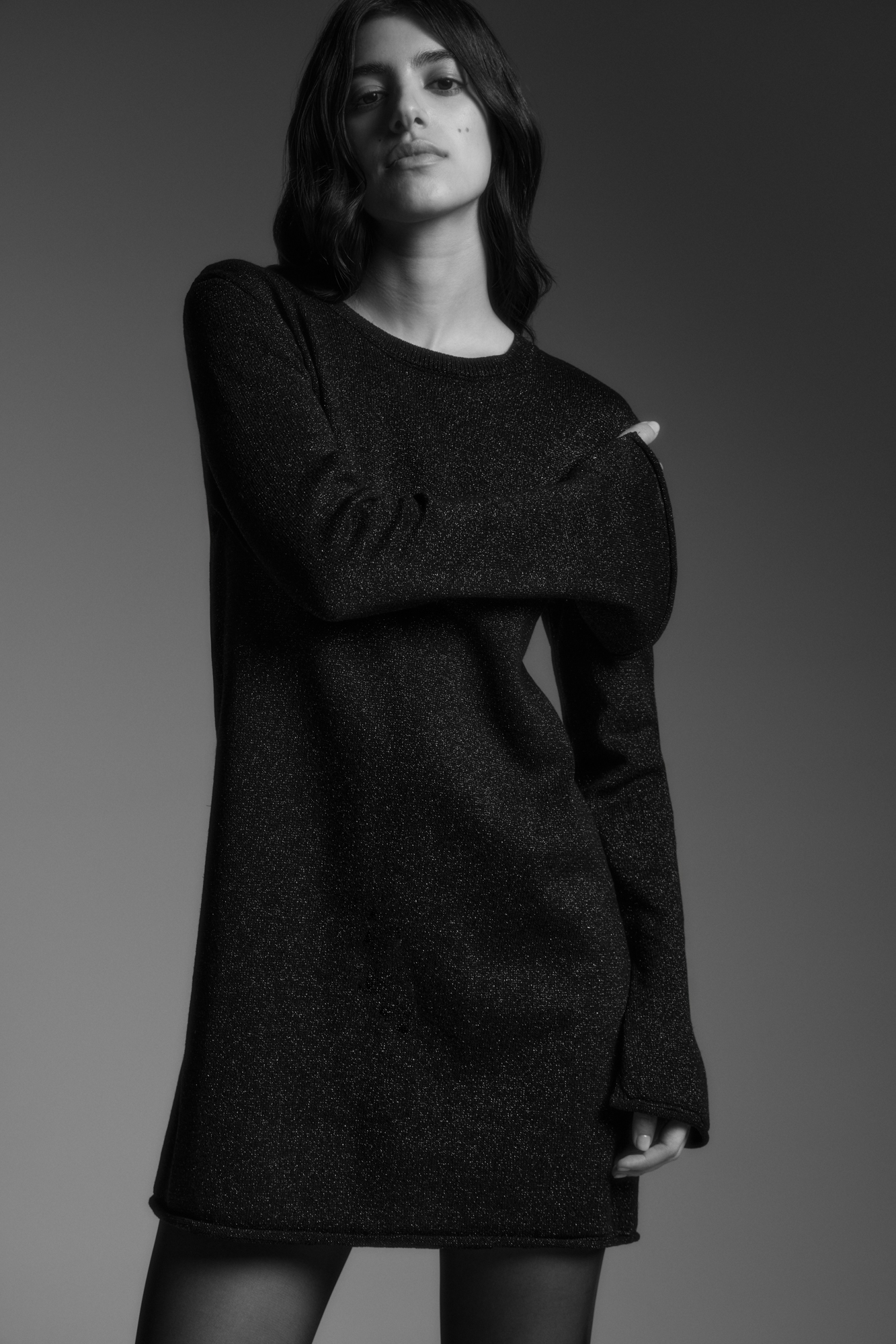 Трикотажное платье длины мини из вискозы с добавлением люрекса. Модель свободного силуэта с круглой горловиной и закрученным краем.