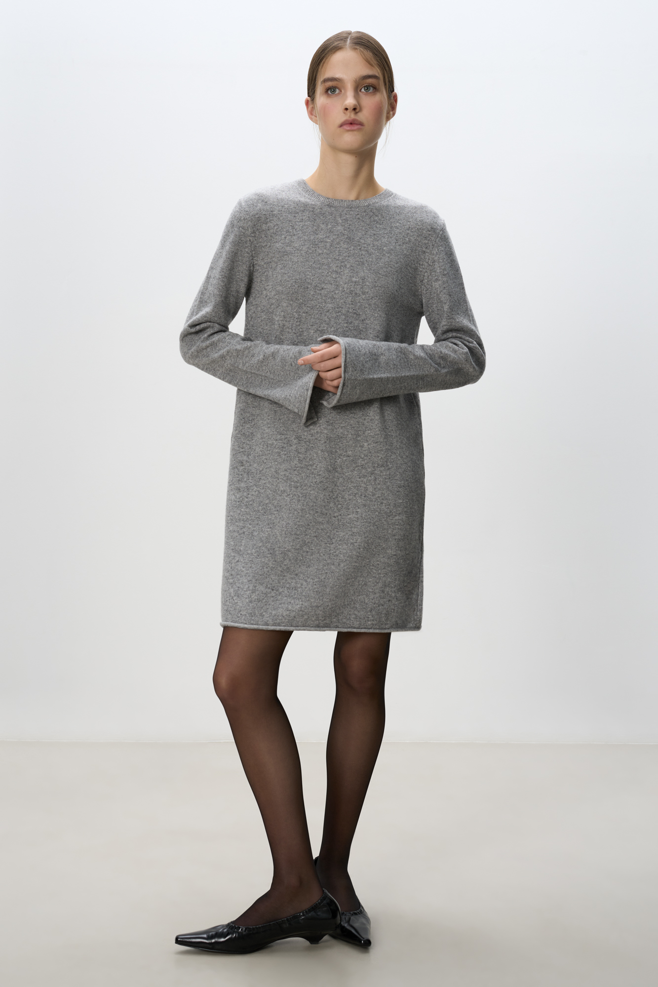 Трикотажное платье длины мини из шерсти с добавлением кашемира. Модель свободного силуэта с длинными рукавами, круглым вырезом горловины и валиком по низу изделия.