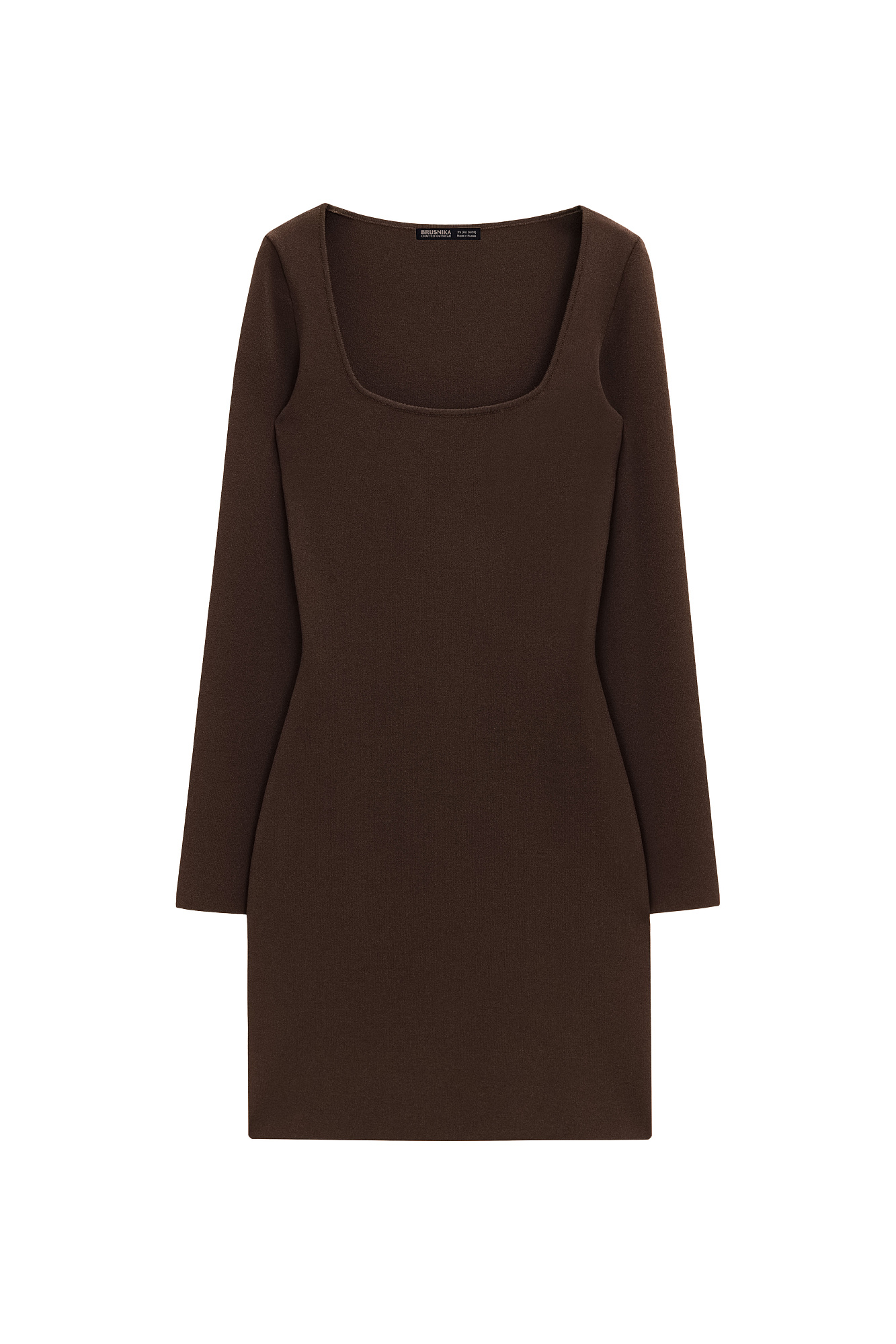 Трикотажное платье-футляр длины мини. Модель приталенного силуэта, с длинным рукавом и квадратным вырезом декольте.