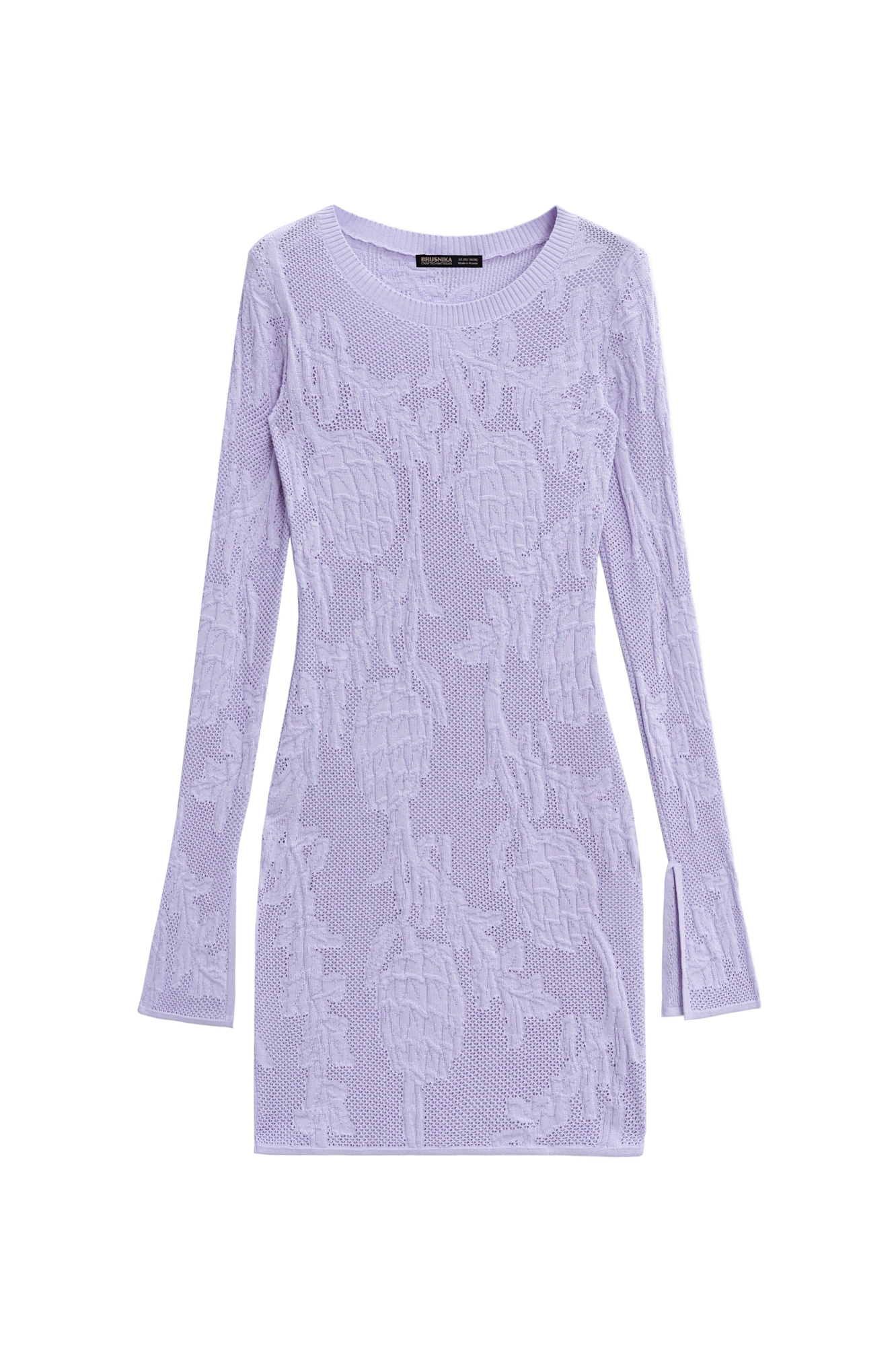 Трикотажное платье длины мини из органического хлопка. Модель приталенного силуэта, с длинными расклешенными рукавами разрезами на манжетах и круглым вырезом горловины. Изделие декорировано объемным растительным орнаментом.