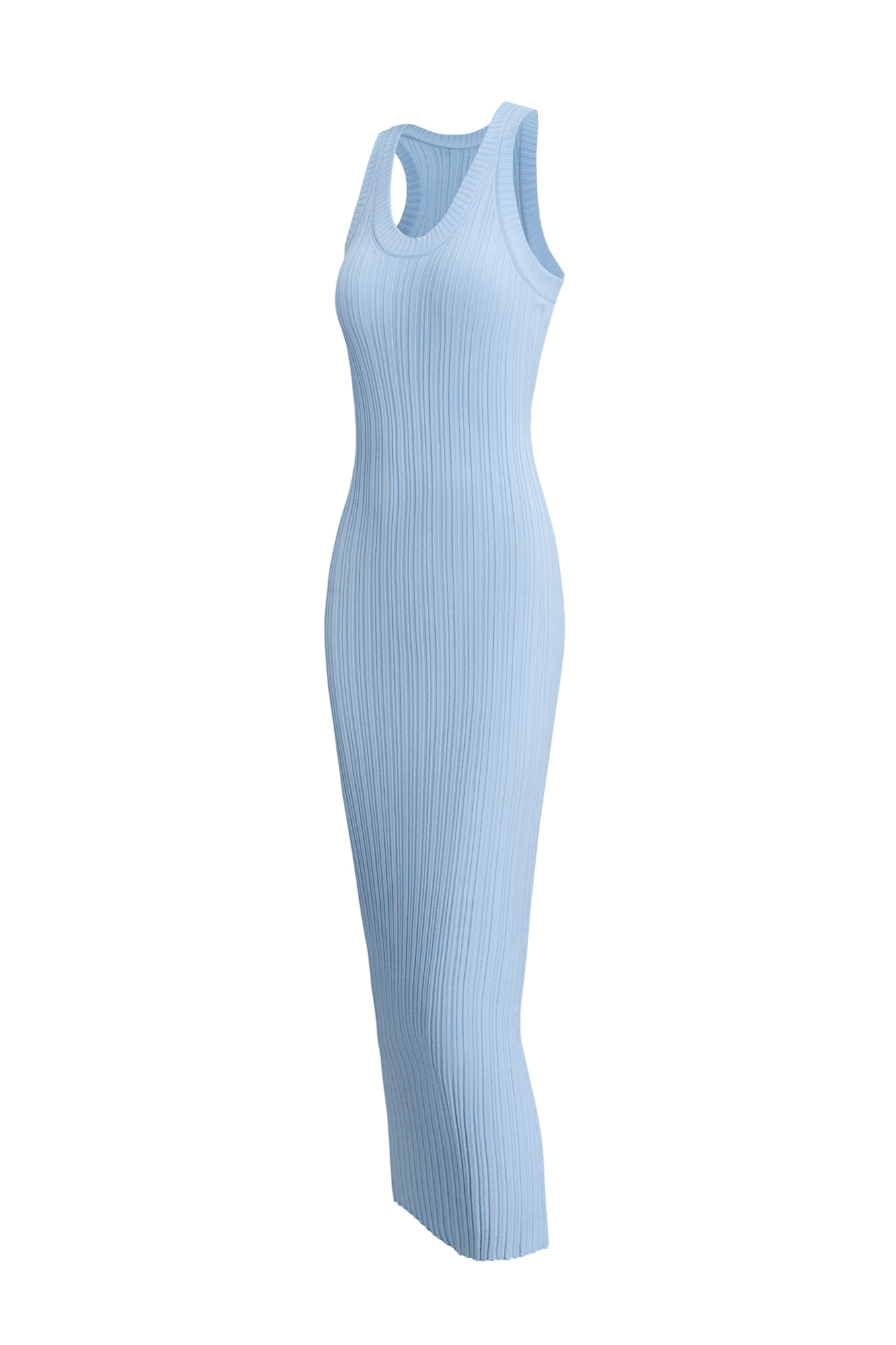 Трикотажное платье миди из тонкой вискозы. Модель приталенного силуэта, без рукавов, с глубокой проймой и U-вырезом горловины. Изделие выполнено в широкий рубчик.