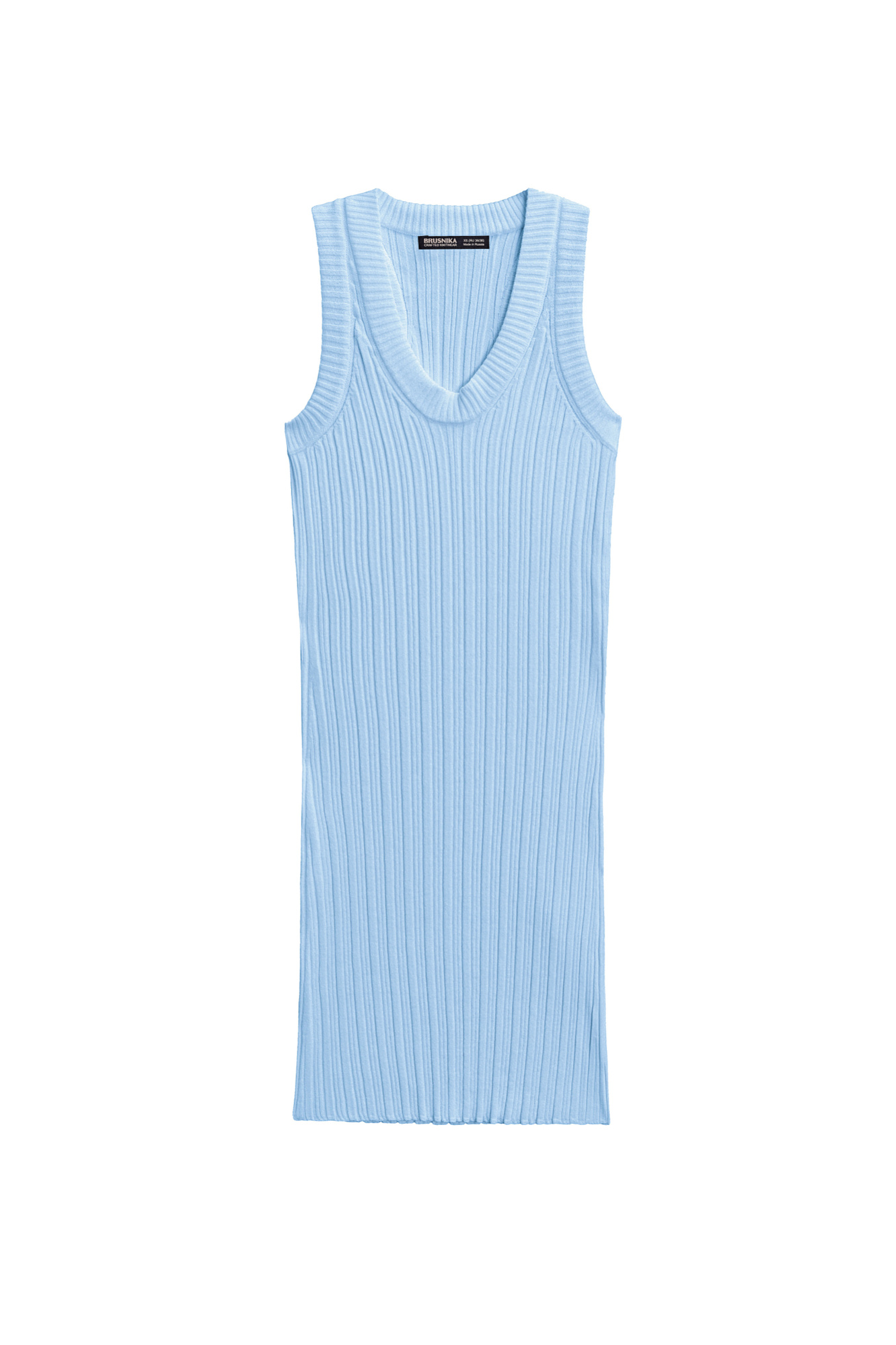 Платье длины мини из фактурного трикотажа на основе вискозы. Модель приталенного силуэта, без рукавов, на широких бретельках, с U-образным вырезом горловины. Изделие выполнено в широкий рубчик.