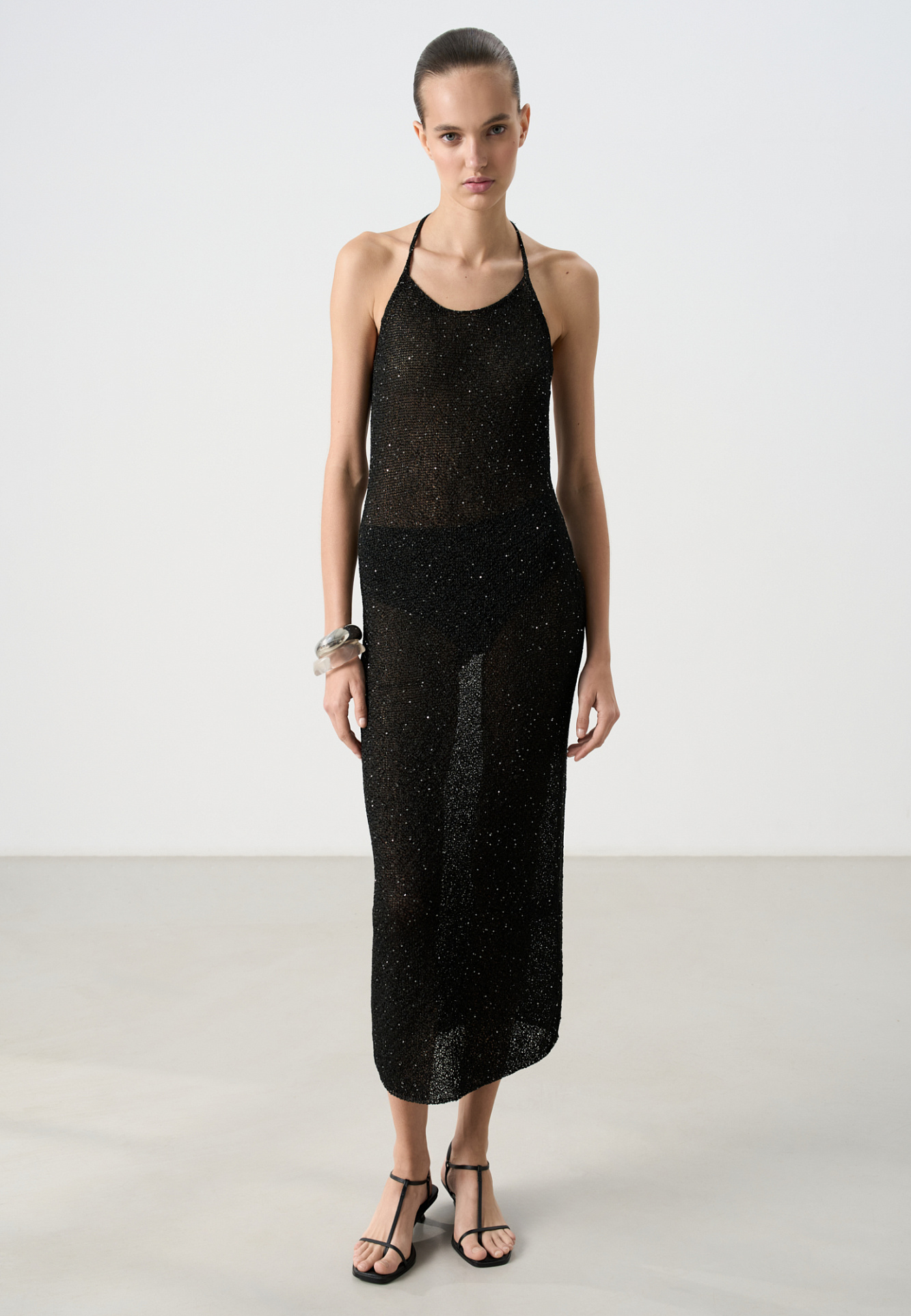 Трикотажное платье длины миди из хлопка с добавлением вискозы. Изделие декорировано мелкими пайетками. Модель прямого кроя с открытой спиной и двумя лямками-завязками на шее. Без подкладки.