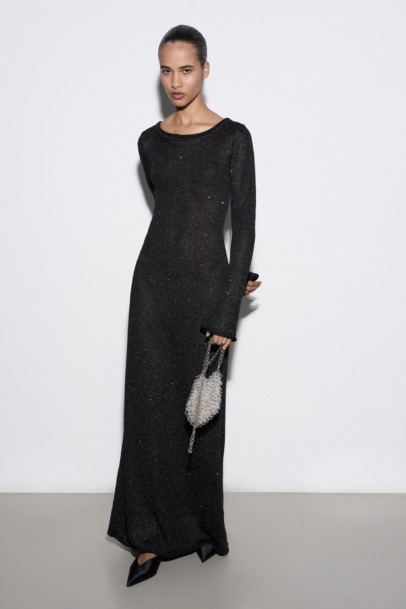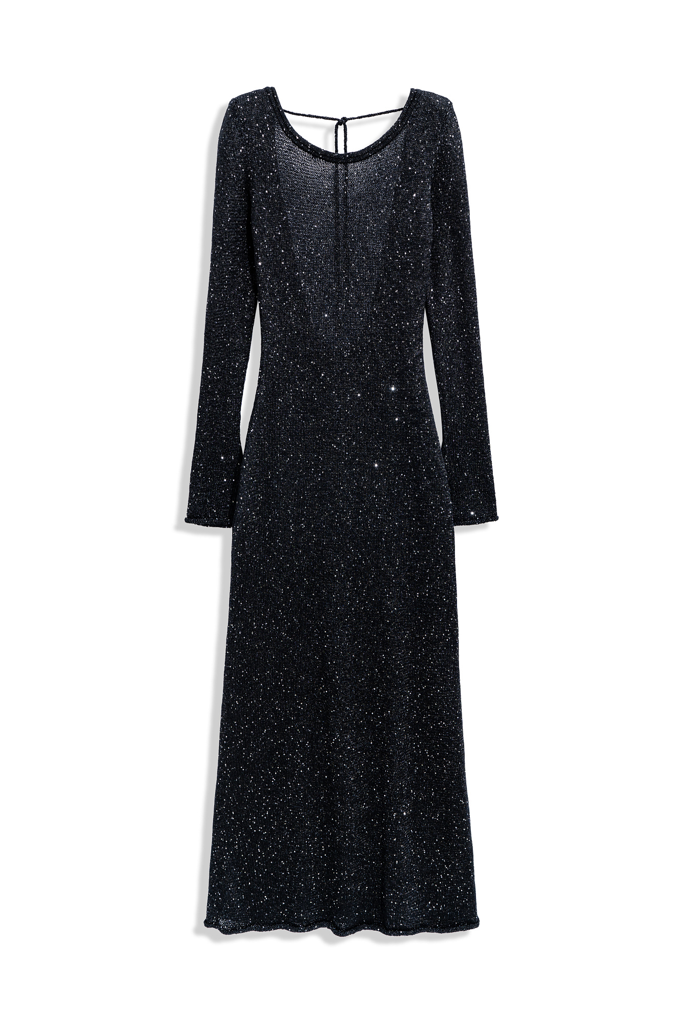 Трикотажное платье длины макси из хлопка с пайетками. Модель приталенного силуэта с длинными рукавами и открытой спиной. Манжеты рукавов и подол декорированы валиками.