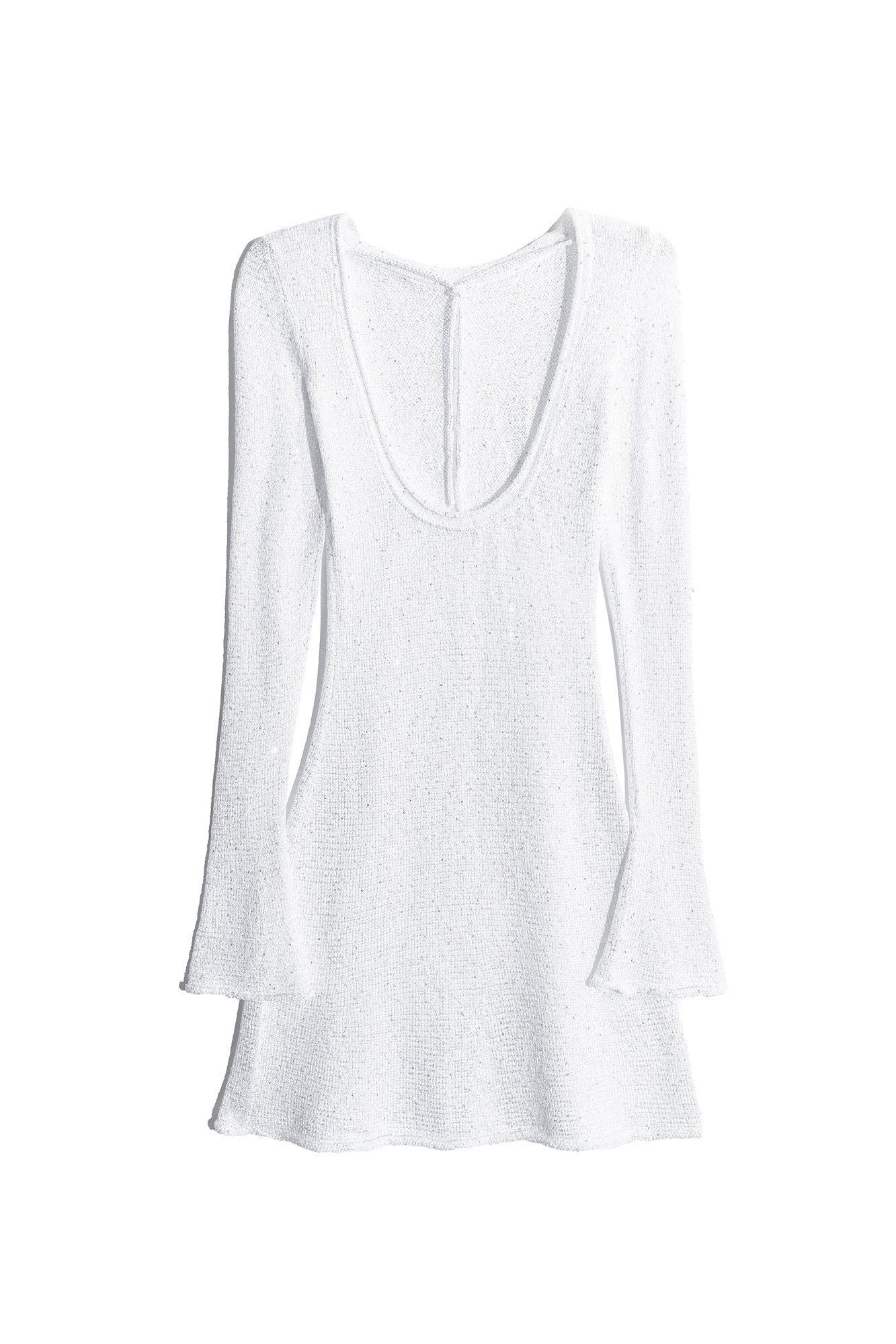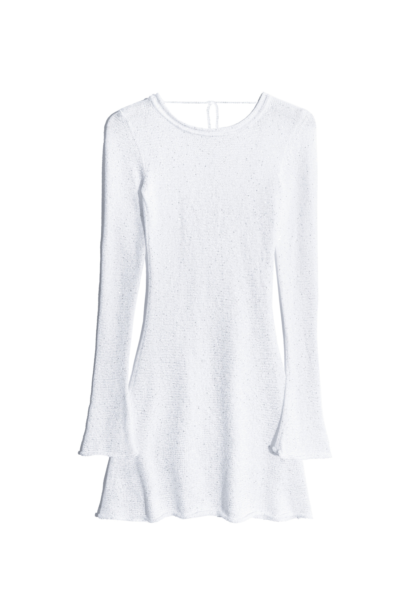 Трикотажное платье длины мини из хлопка с пайетками. Модель приталенного силуэта с длинными рукавами и открытой спиной. Манжеты рукавов и подол декорированы валиками.