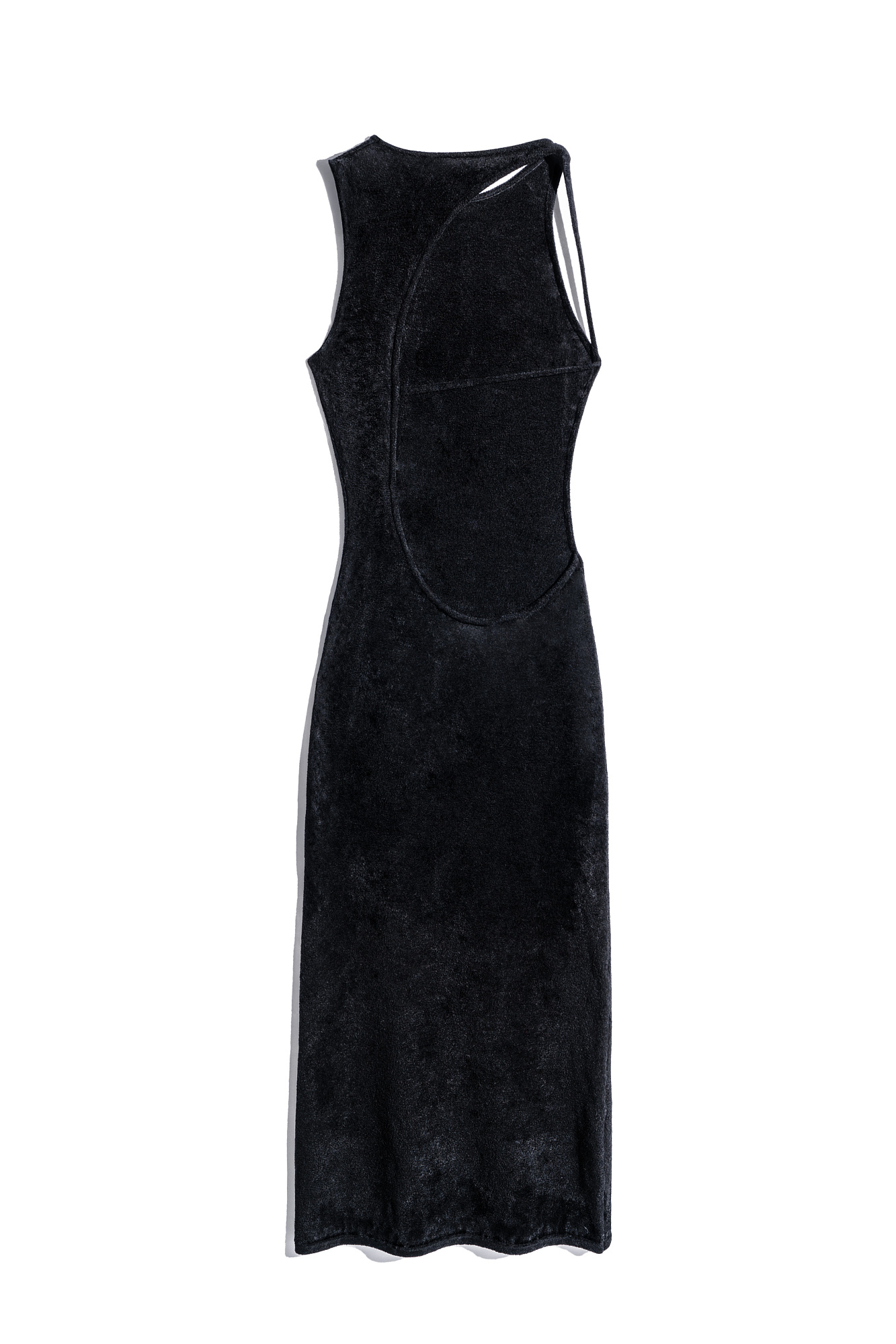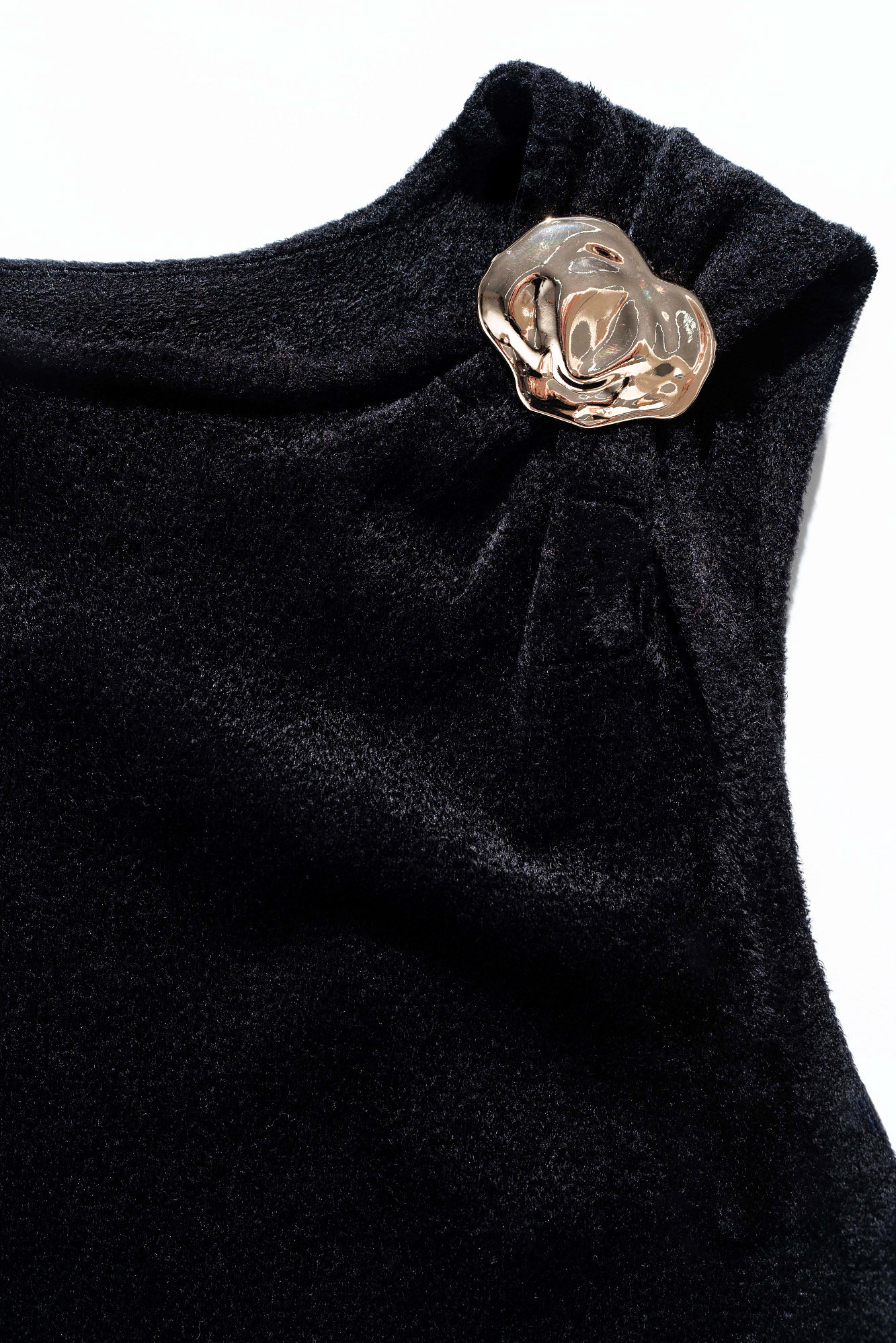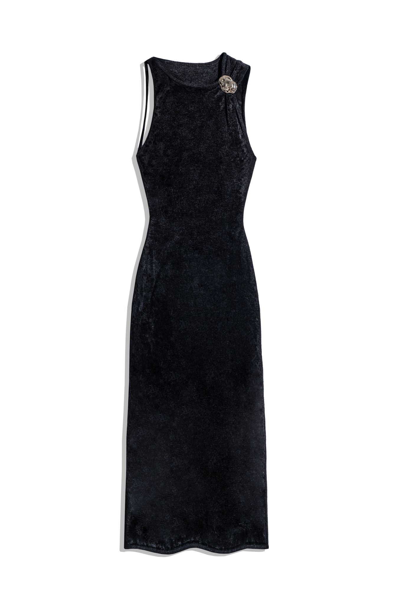 Вечернее платье длины макси из вискозы. Модель приталенного силуэта с открытой спиной, драпировка на плече декорирована металлической перемычкой.