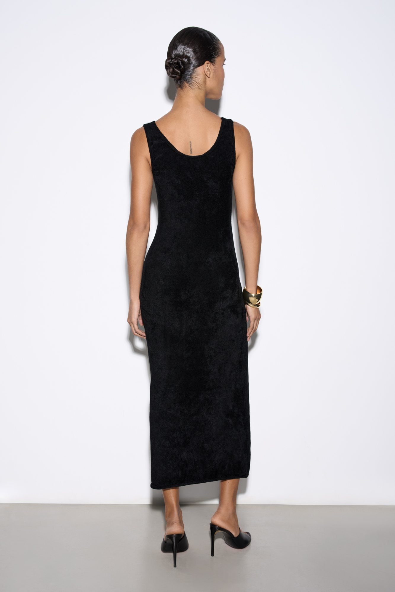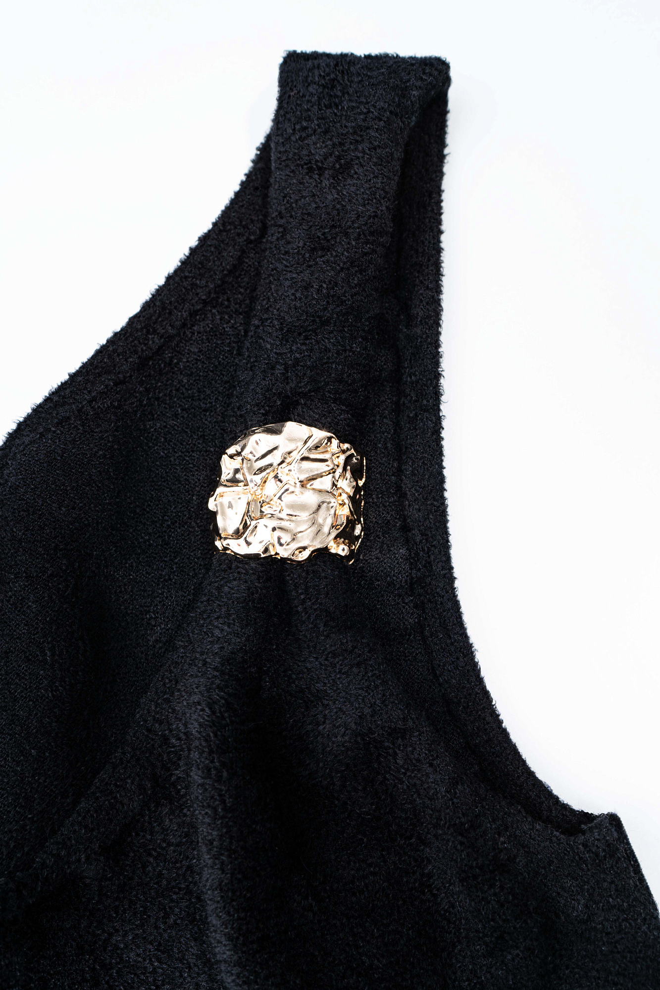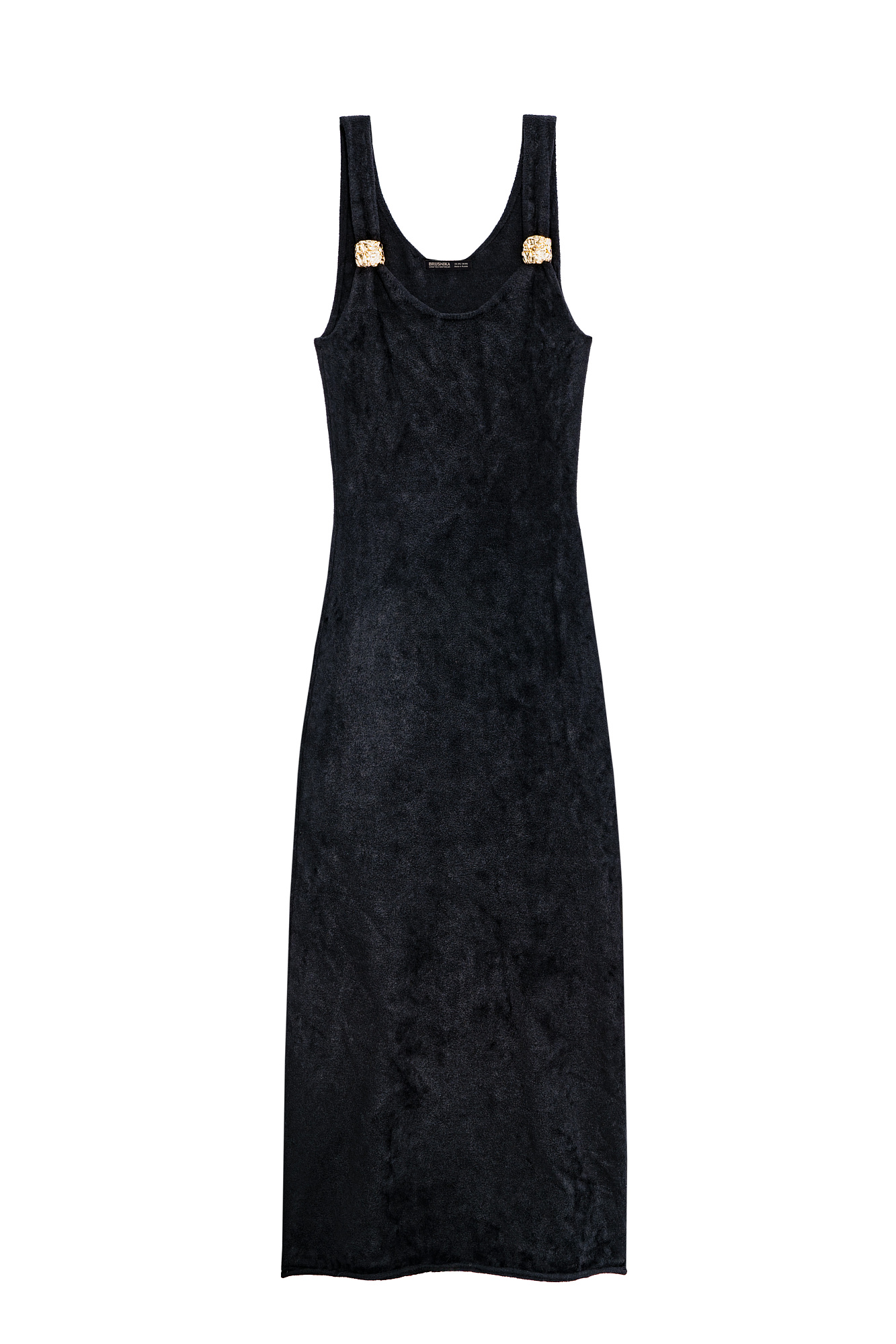 Вечернее платье длины макси из вискозы. Модель по фигуре на широких бретельках, декорированных металлическими перемычками.