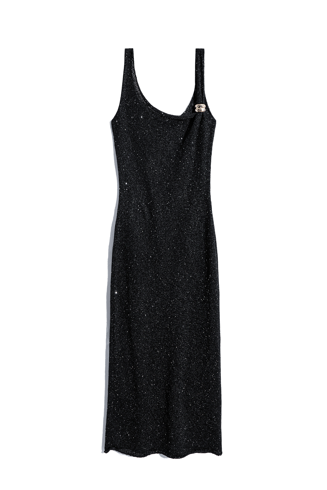 Трикотажное платье длины макси из хлопка с пайетками. Модель приталенного силуэта на бретельках и асимметричным вырезом декольте.