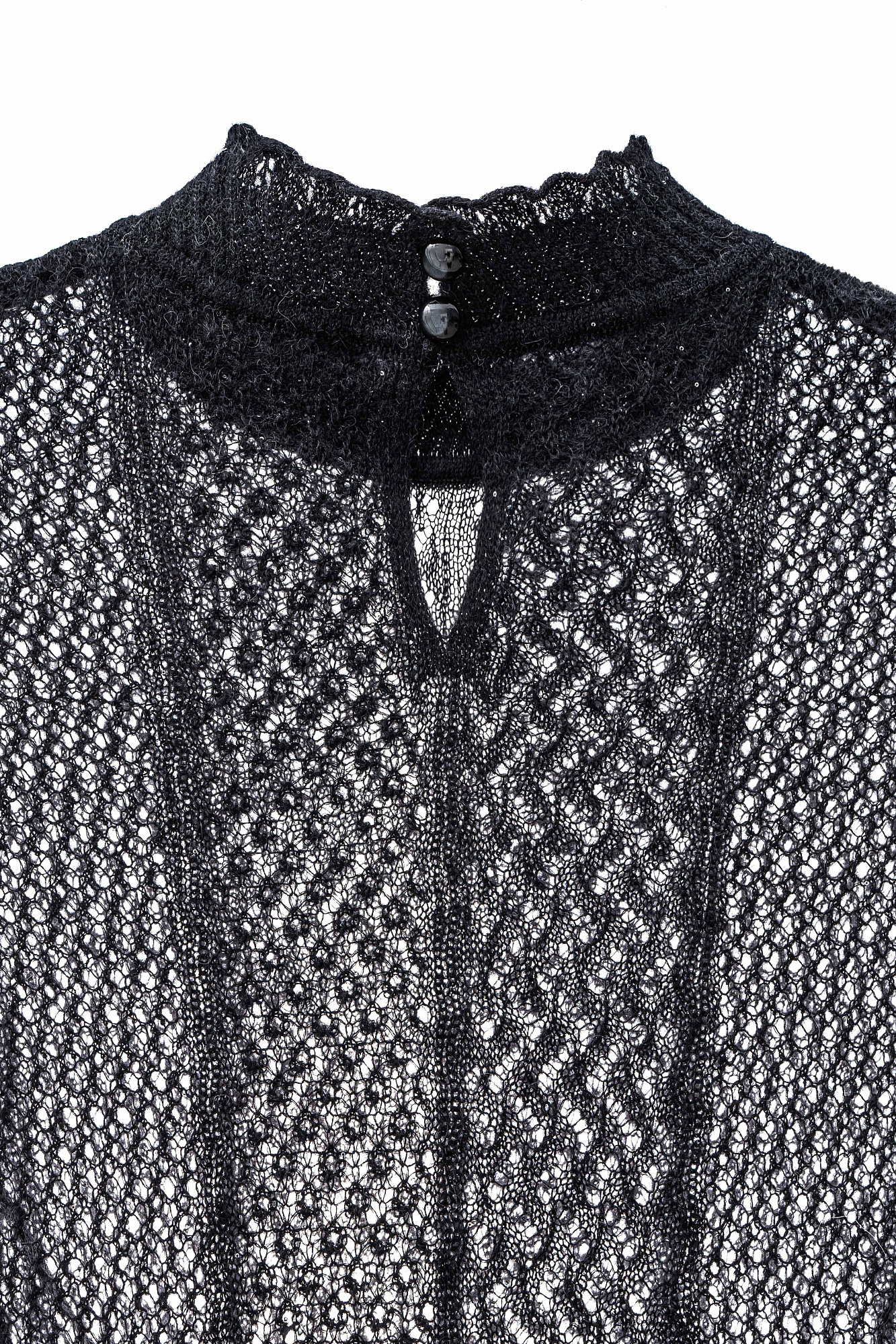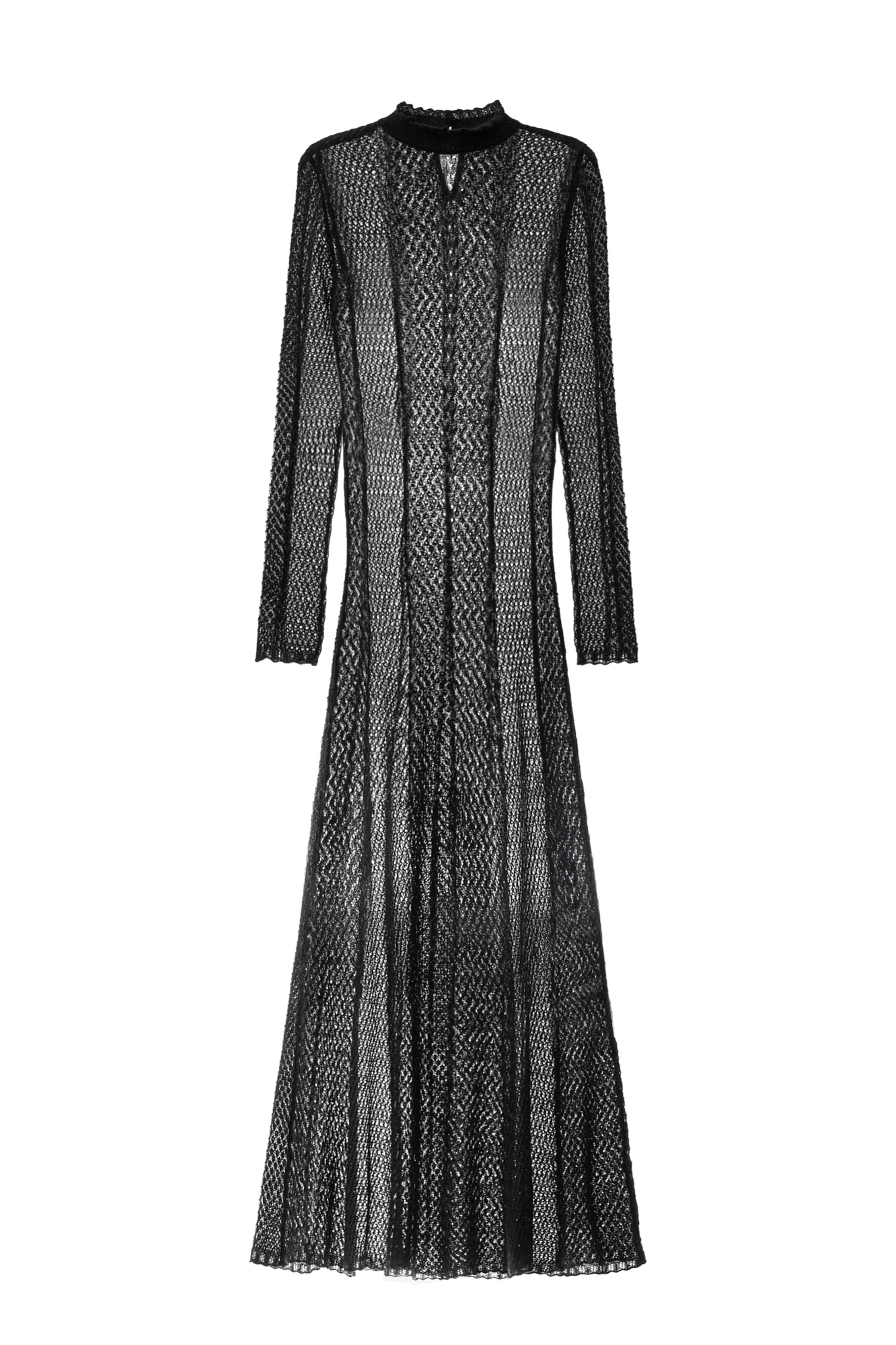 Трикотажное ажурное платье длины макси из шерсти альпака и мохера. Изделие выполнено комбинированной вязкой, сочетающей несколько ажурных узоров. Модель с длинными рукавами и воротником стойкой.