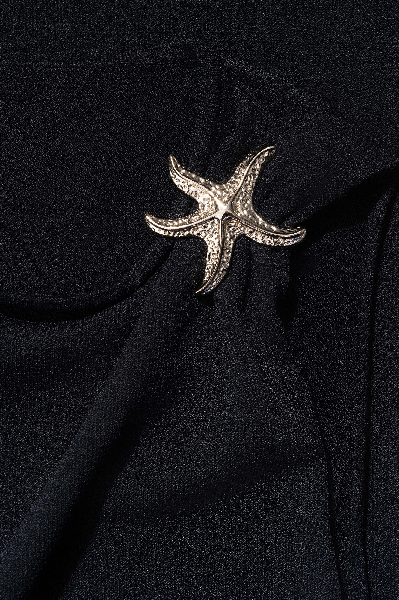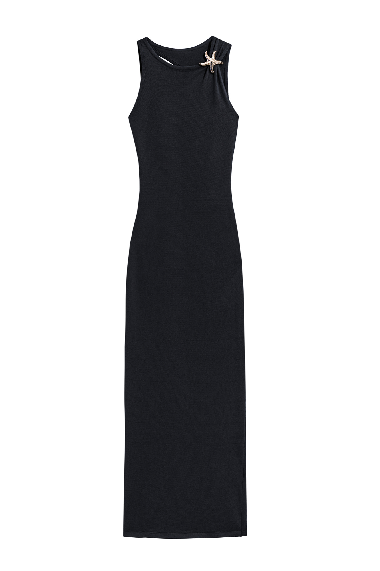 Платье длины макси из вискозы. Модель приталенного силуэта с круглым вырезом горловины, без рукавов, с вырезом на спине. Изделие декорировано акцентным элементом на плече в виде морской звезды.