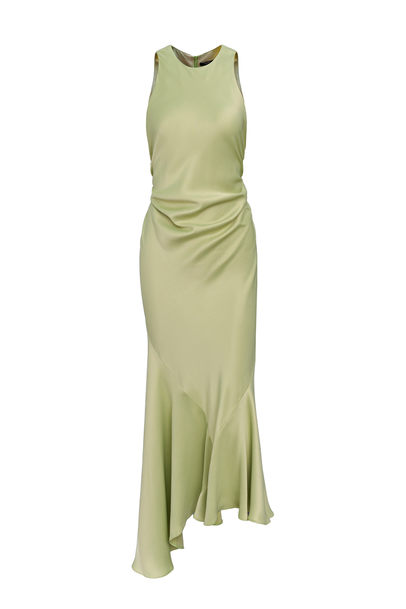 Атласное платье длины макси. Модель приталенного силуэта, с круглым вырезом горловины, без рукавов. Модель декорирована асимметричной юбкой и драпировкой на талии.