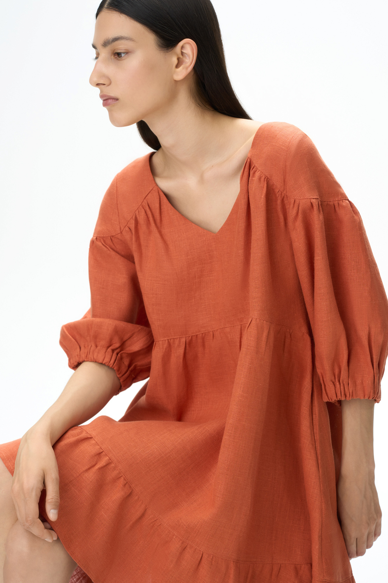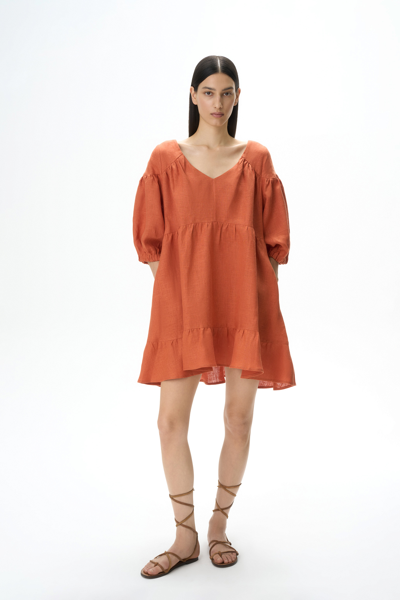 Короткое платье из 100% льна с расклешением от талии и широким асимметричным воланом внизу. Модель свободного кроя с коротким рукавом на резинке и V-образным вырезом с завязками на спине.