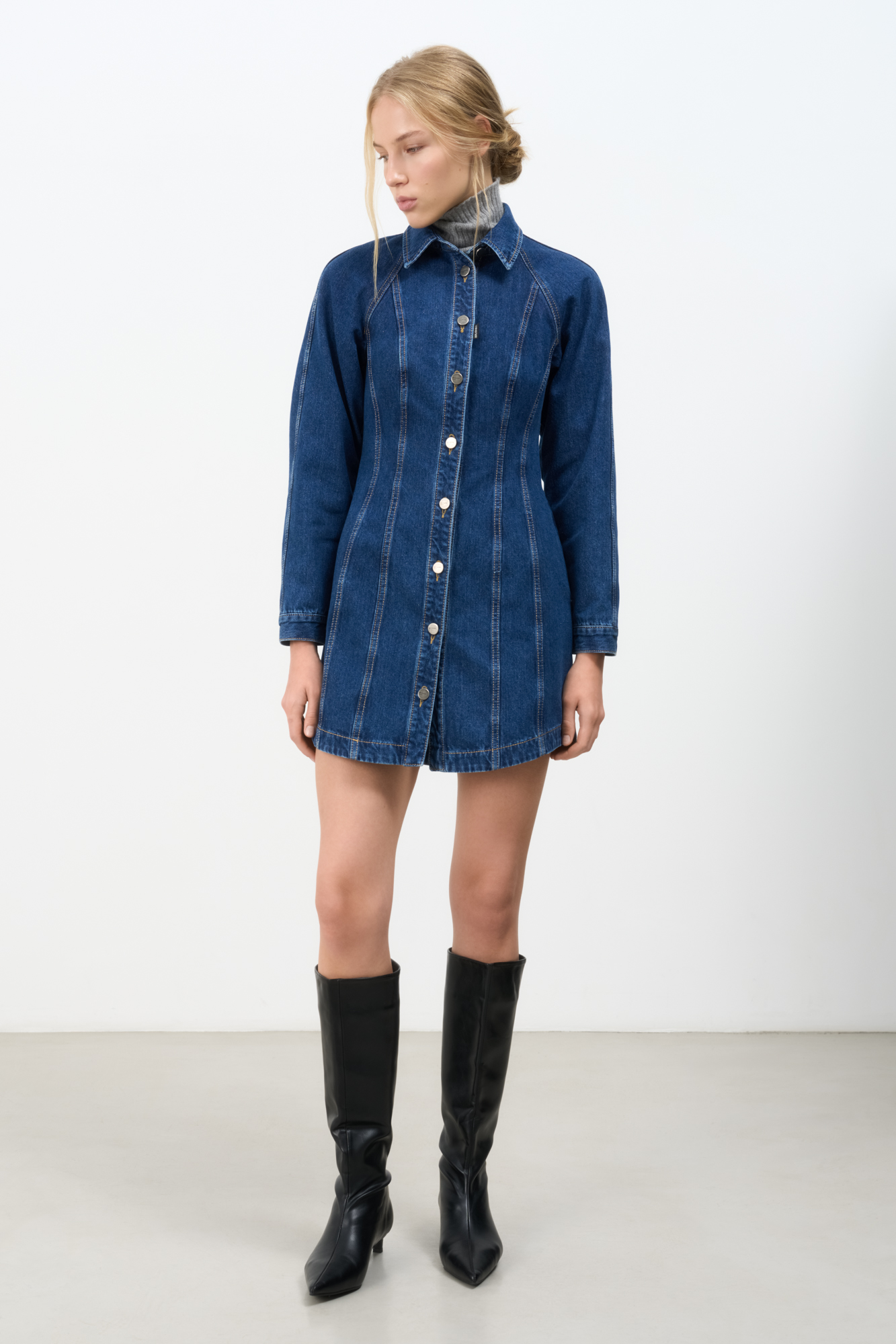 Джинсовое платье из 100% хлопка длины мини. Модель приталенного силуэта, с длинным рукавом реглан и отложным воротником. Застежка на пуговицы.