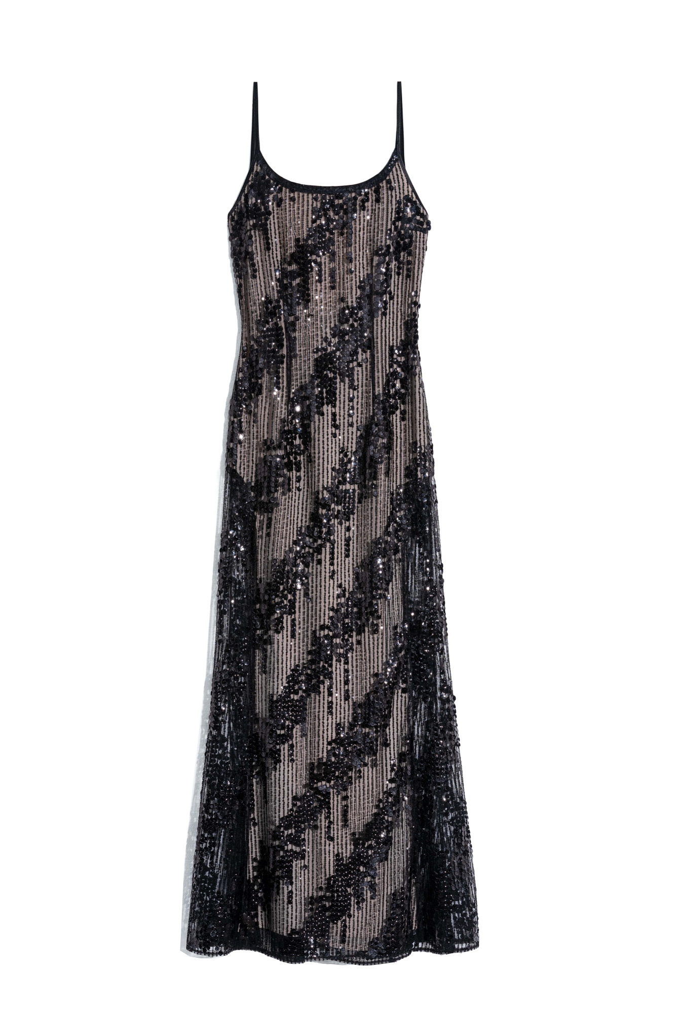 Платье с пайетками на тонких бретелях. Модель приталенного силуэта длины макси с вырезом на спине и застежкой на молнию.