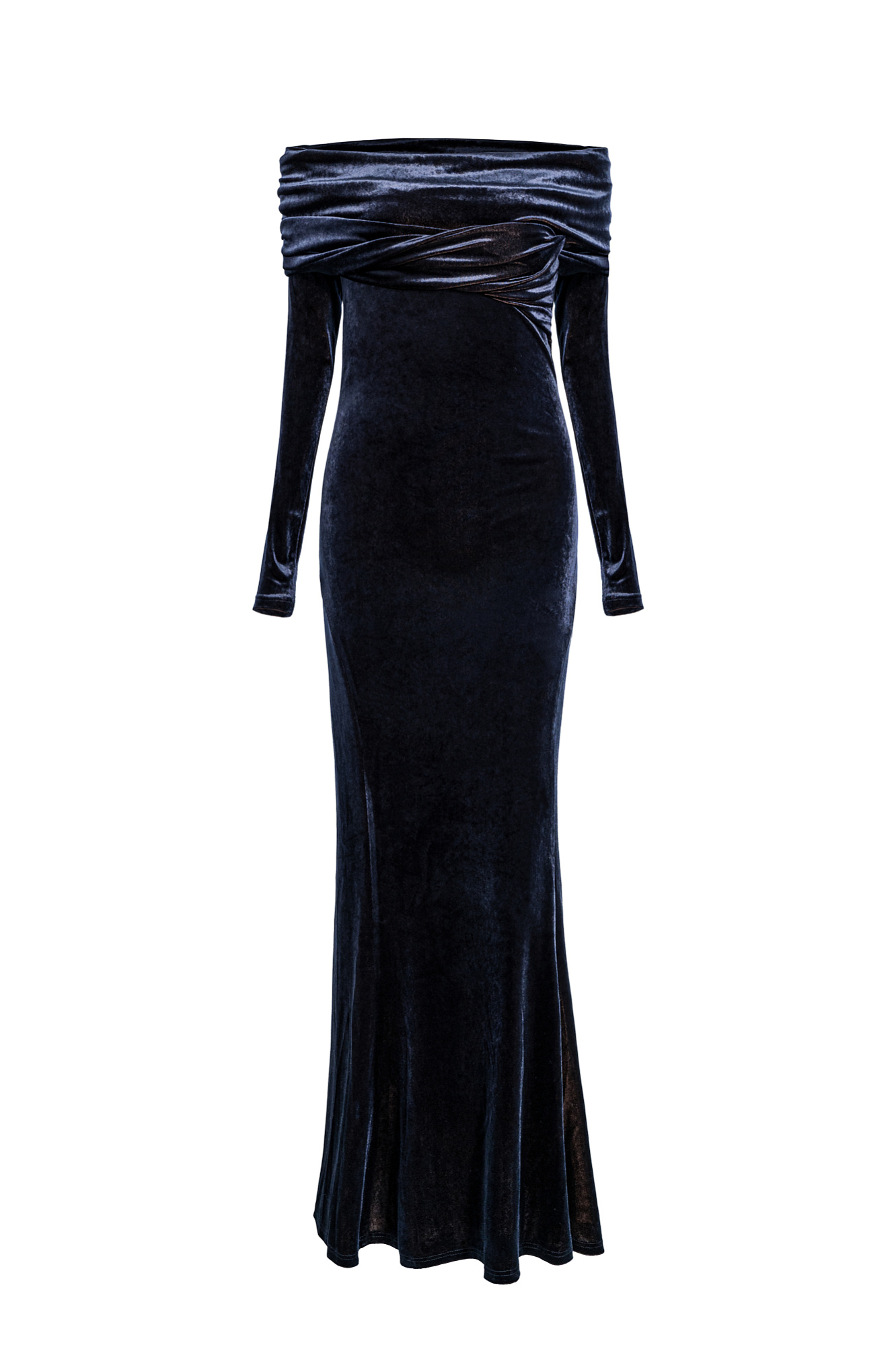 Платье из велюра длины макси. Модель приталенного силуэта с открытой линией плеч и длинными рукавами. Изделие декорировано драпировкой. Благодаря необычной текстуре ткани достигается эффект перелива цвета.