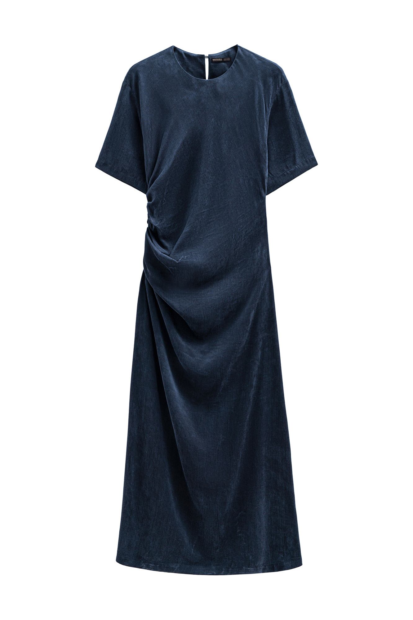 Платье длины миди из купры. Модель свободного кроя, с круглым вырезом горловины, спущенной линией плеч, короткими рукавами и драпировкой на талии сбоку. Застежка на пуговицу сзади.
