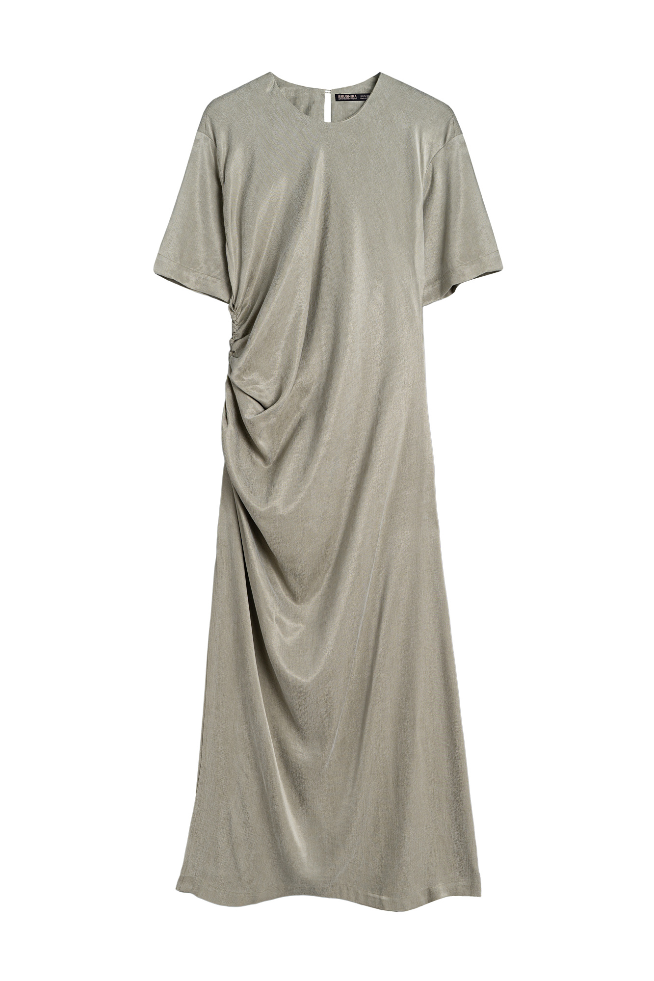 Платье длины миди из купры. Модель свободного кроя, с круглым вырезом горловины, спущенной линией плеч, короткими рукавами и драпировкой на талии сбоку. Застежка на пуговицу сзади.