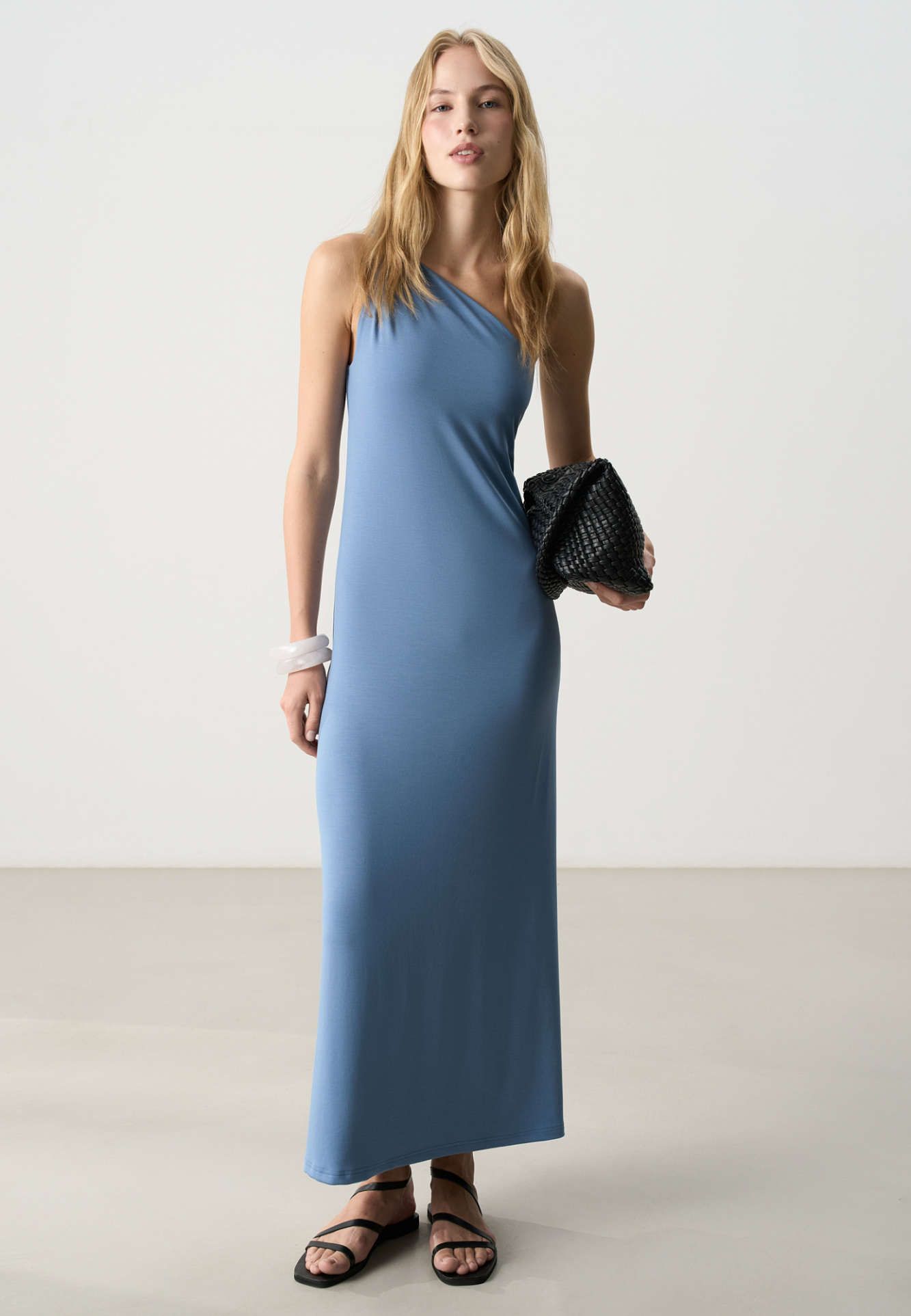 Платье длины макси из модала. Модель свободного кроя, с асимметричным верхом и перекрученной лямкой на одно плечо.