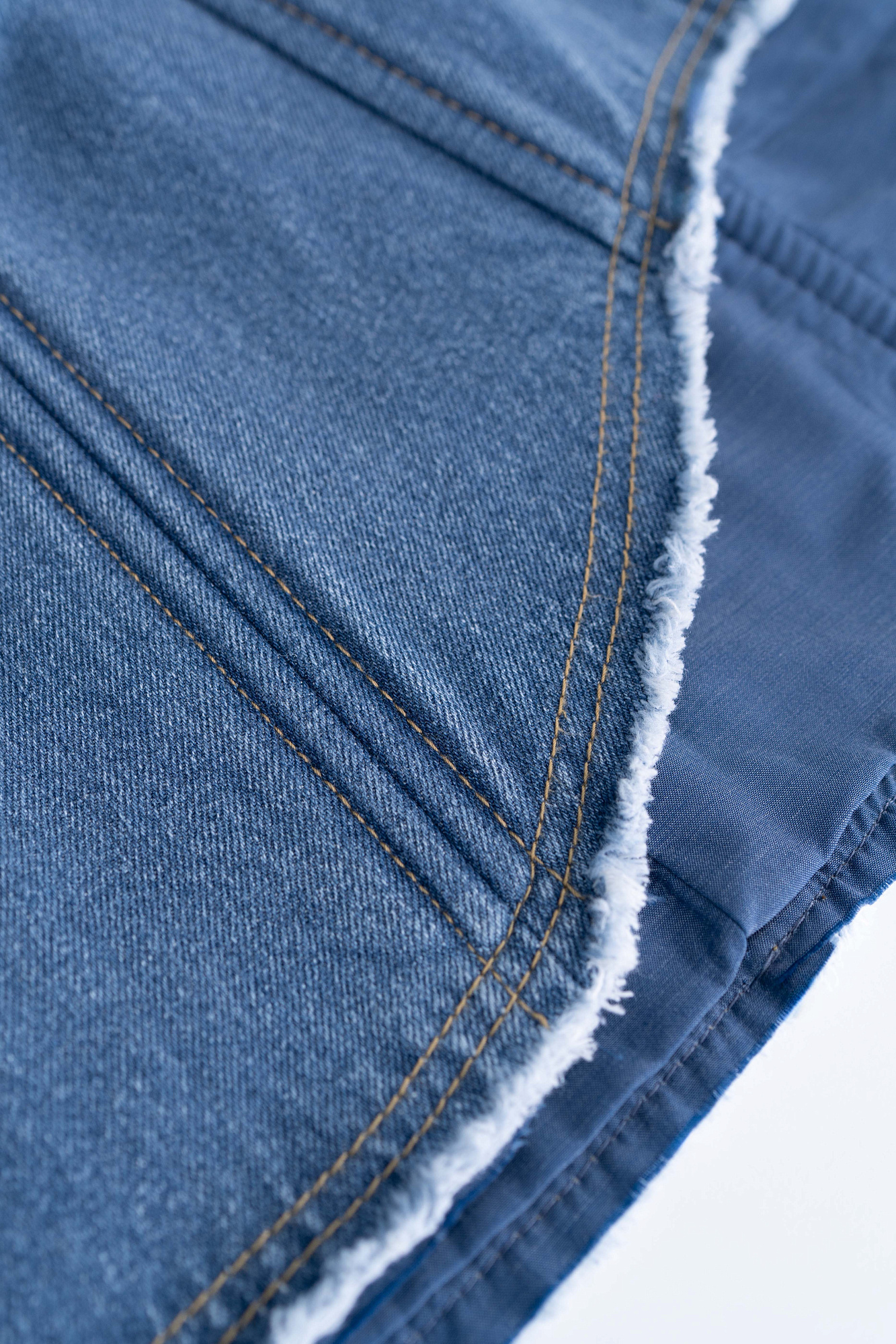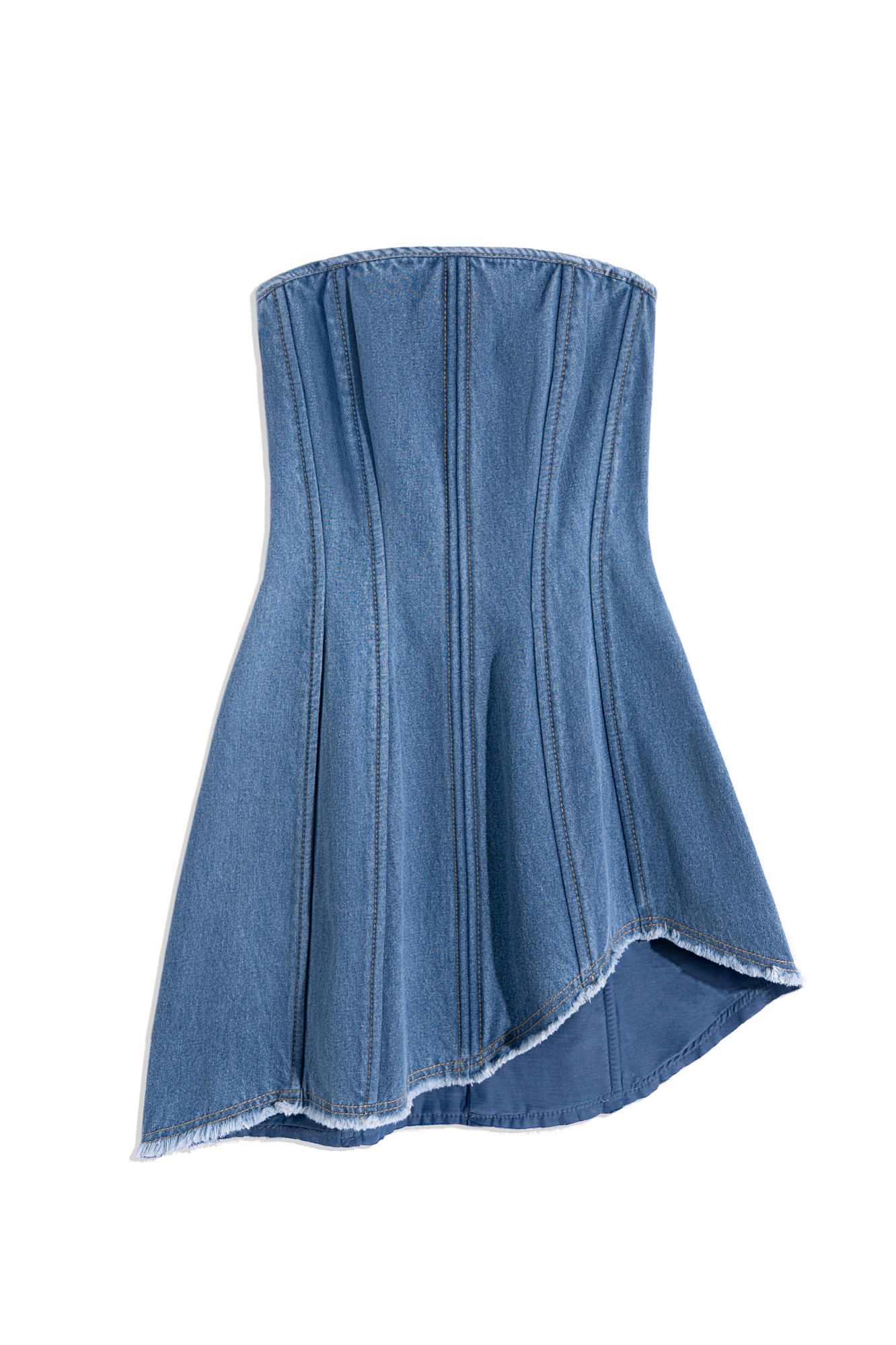 Приталенное джинсовое платье мини с ребрами жесткости, позаимствованными у корсетов. Плавный вырез декольте. Неровный крой подола со складками. Застежка на молнию.