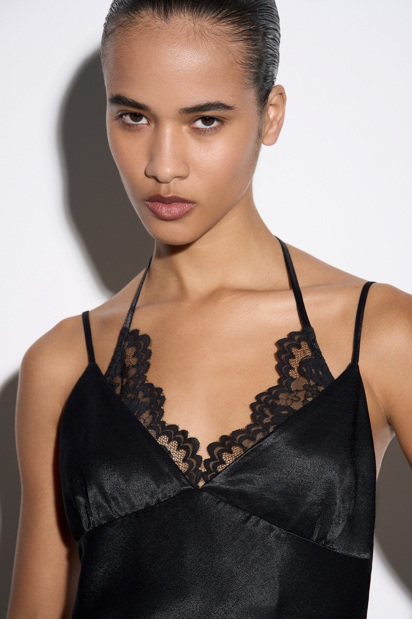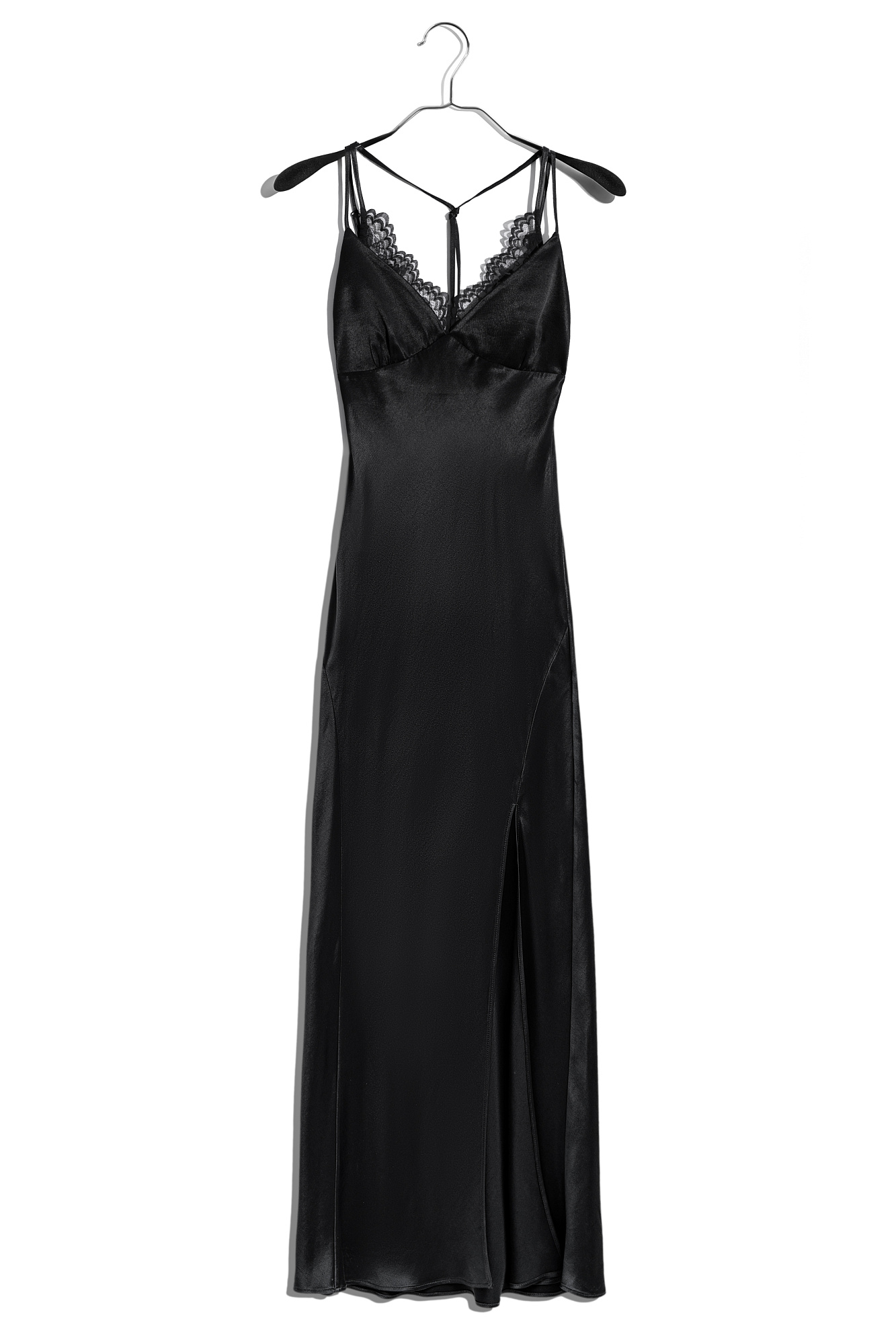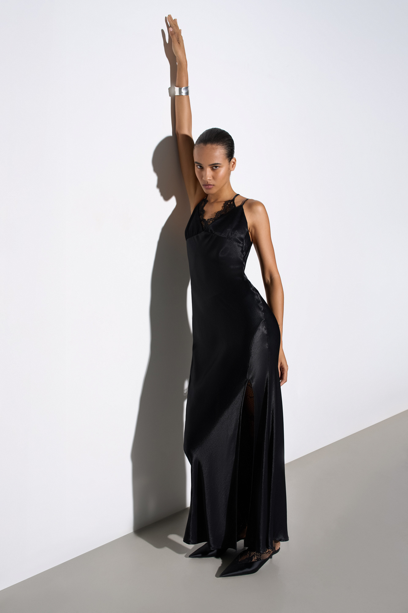 Платье-комбинация длины макси из атласной вискозы. Модель приталенного силуэта, на тонких регулируемых бретельках и высоким вырезом сбоку. Декольте изделия декорировано шифоновыми вставками.