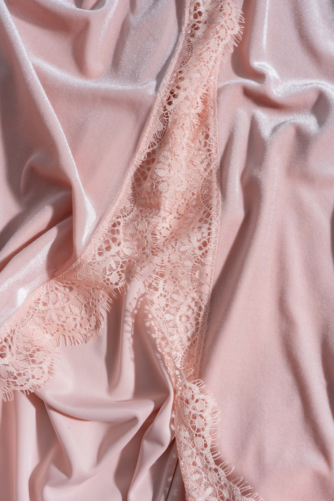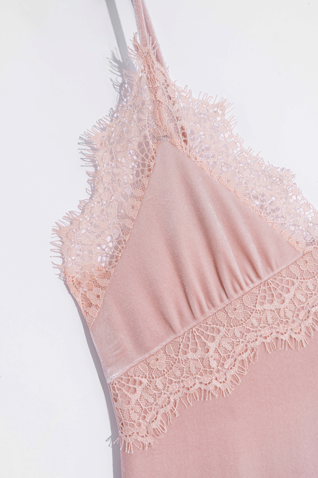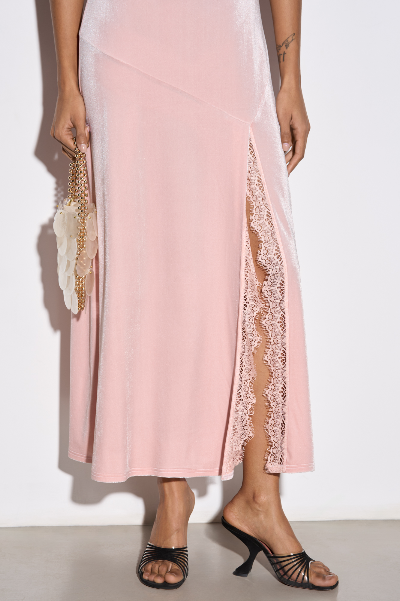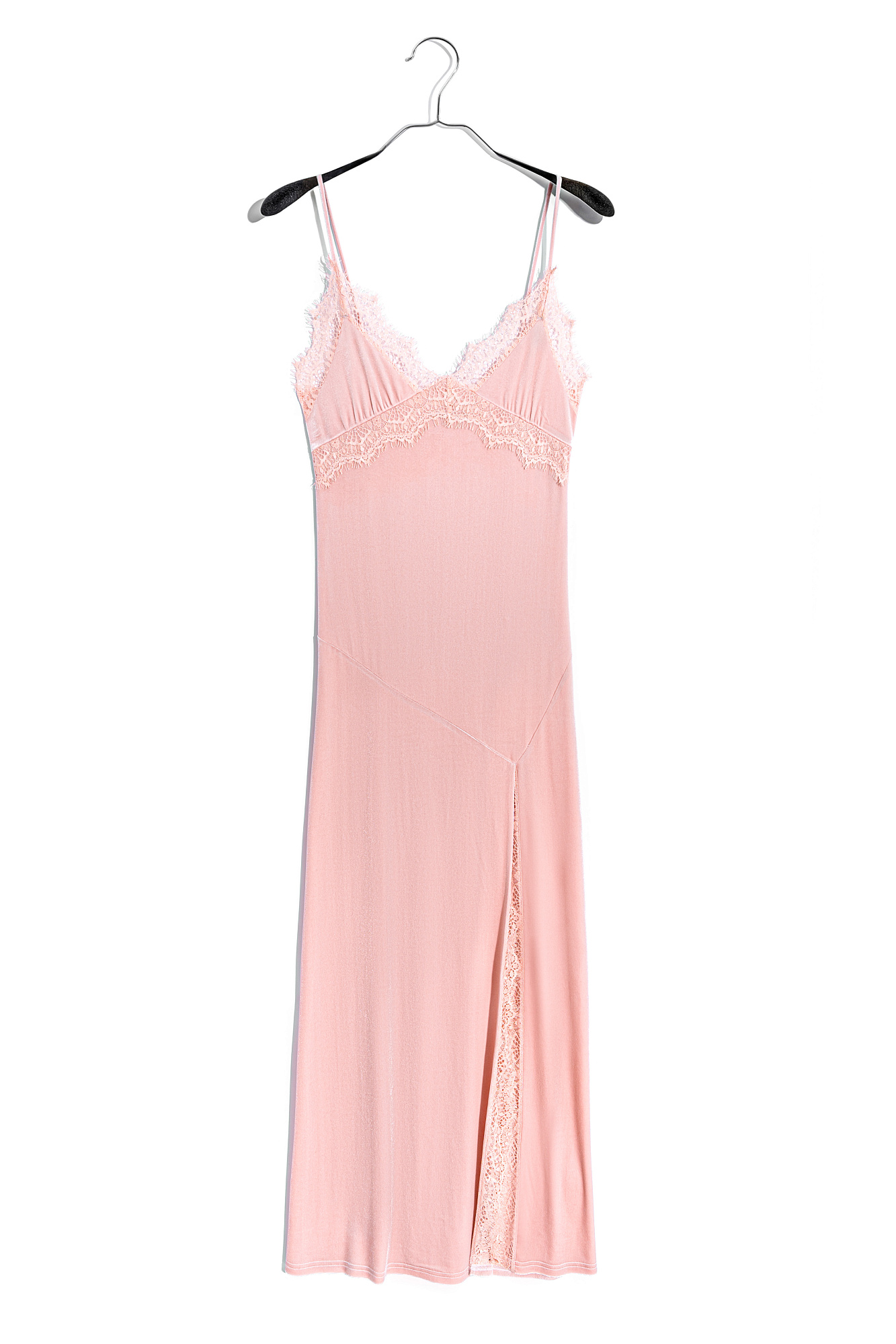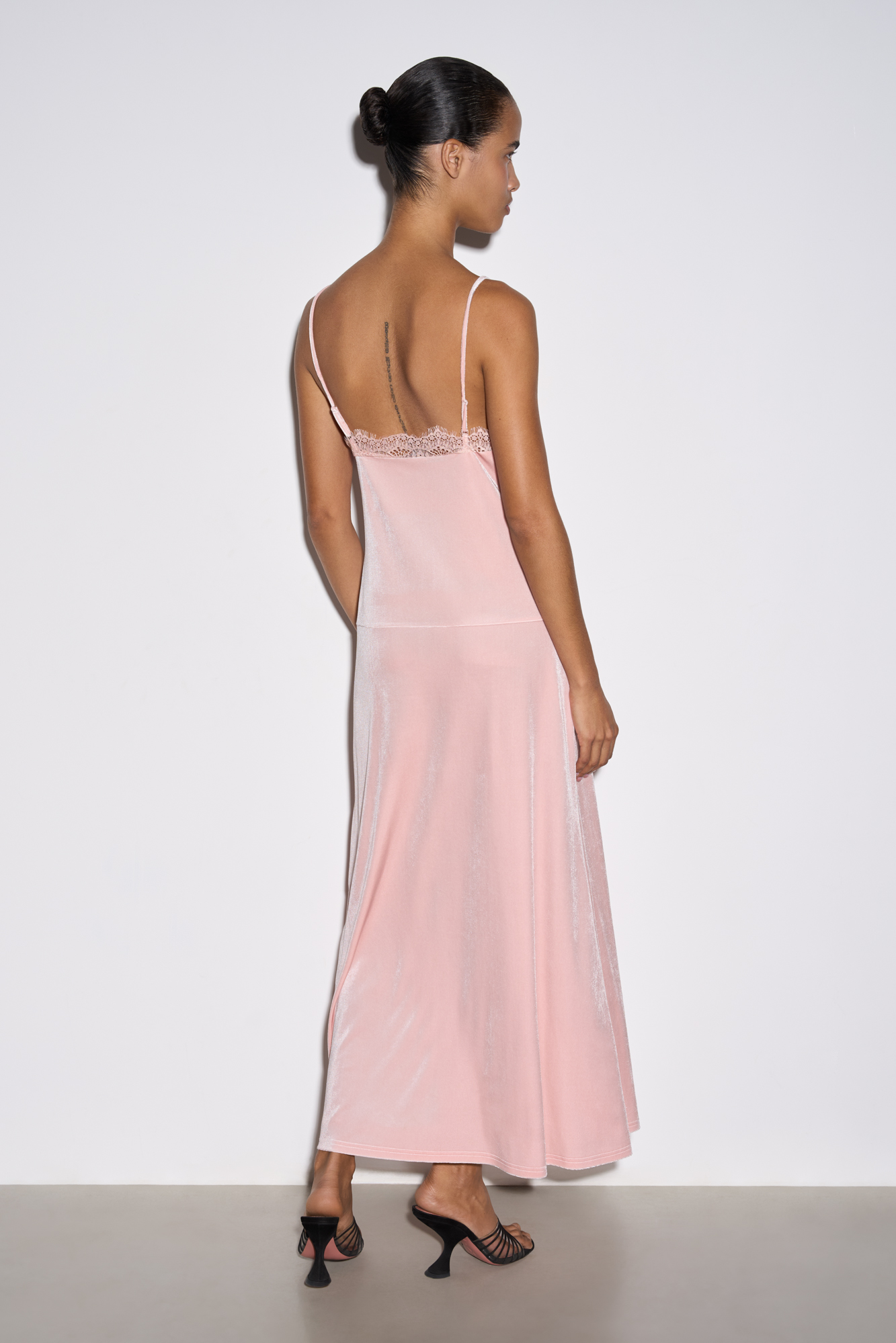Платье-комбинация длины макси из бархатной вискозы. Модель приталенного силуэта на тонких бретельках и высоким разрезом сбоку. Изделие декорирорвано кружевом.