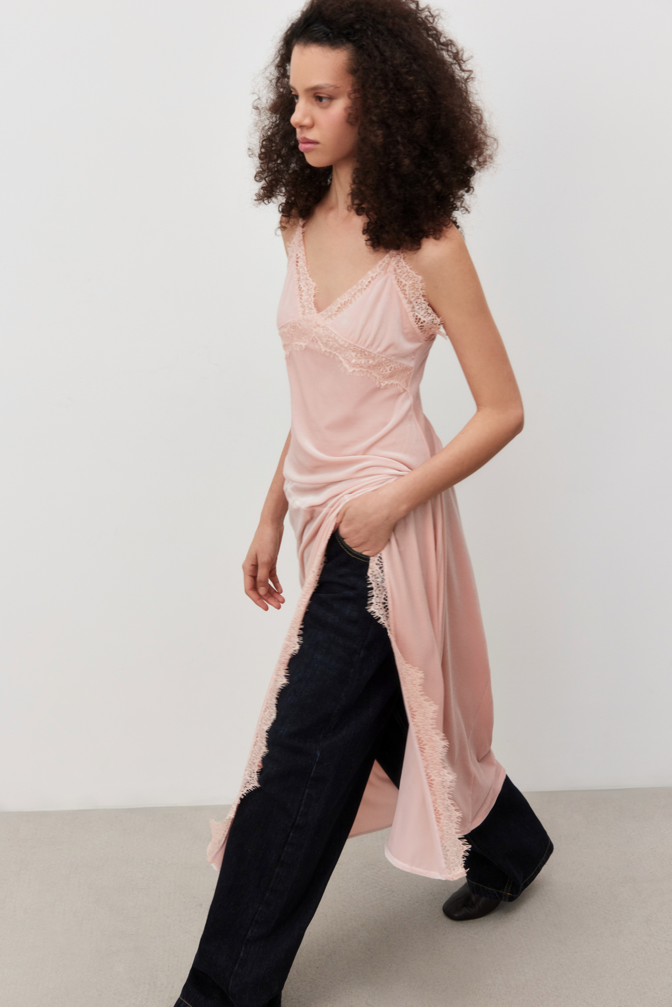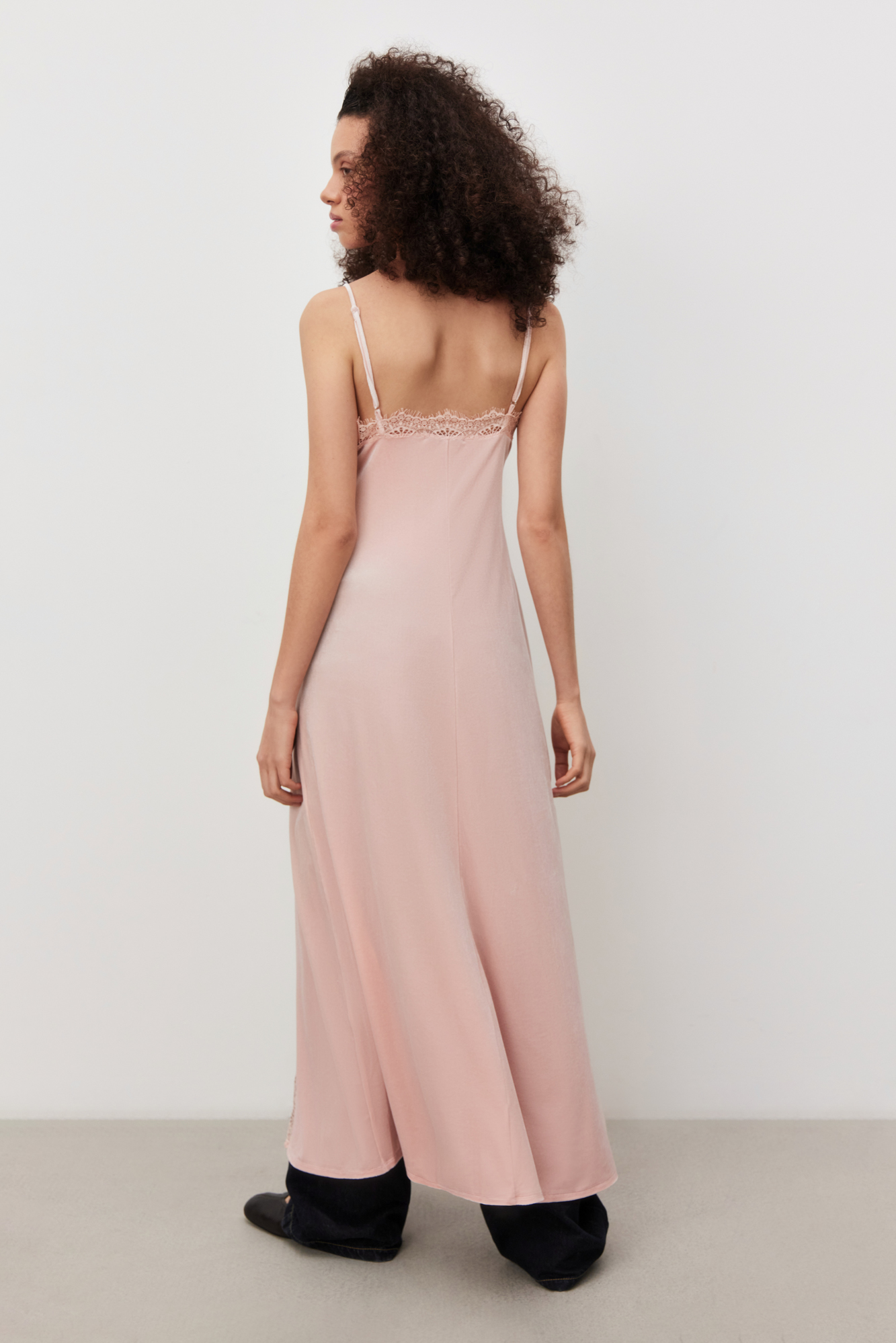 Платье-комбинация длины макси из бархатной вискозы. Модель приталенного силуэта на тонких бретельках и высоким разрезом сбоку. Изделие декорировано кружевом.