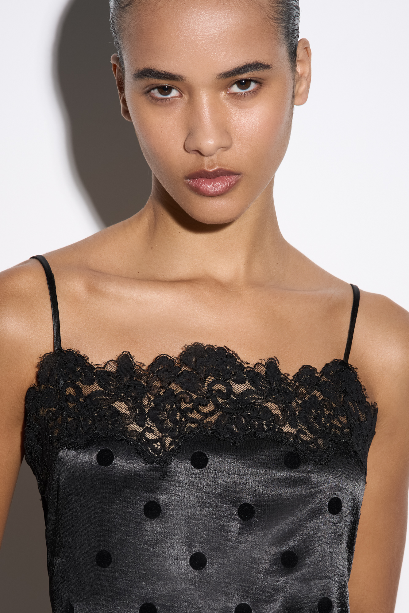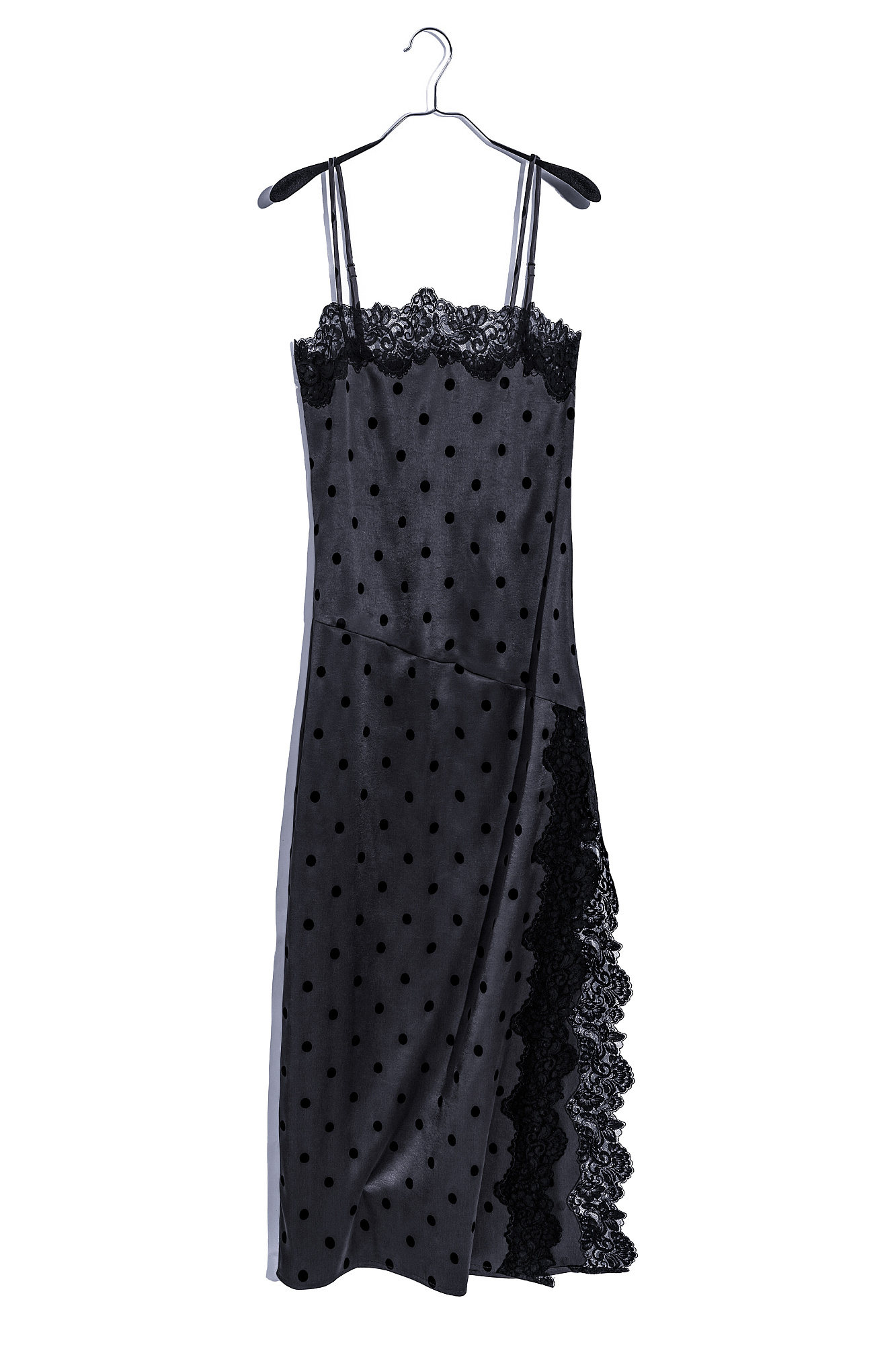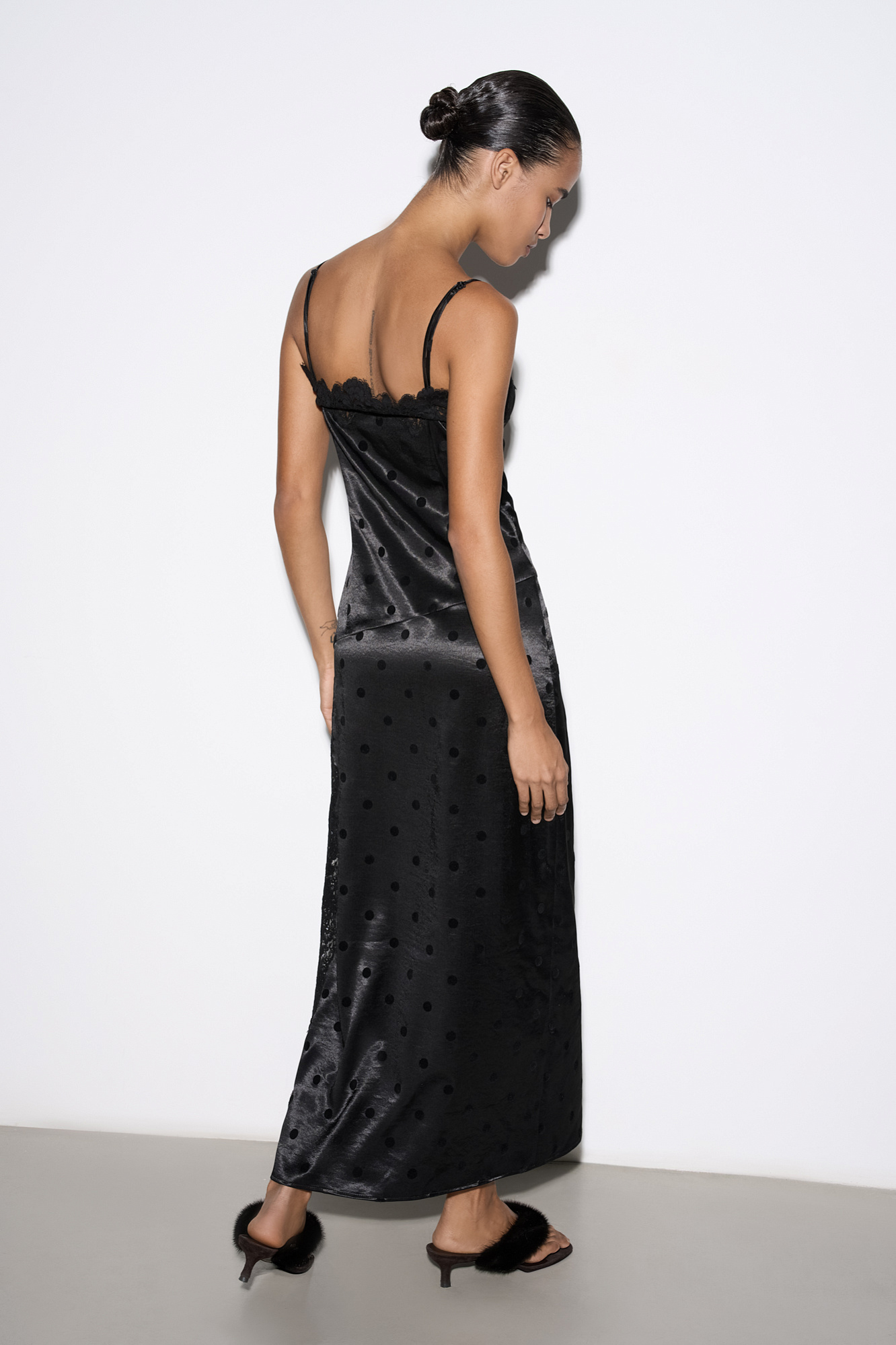 Атласное платье-комбинация длины макси в горох. Модель приталенного силуэта на тонких бретельках и высоким разрезом сбоку. Изделие декорировано кружевом.