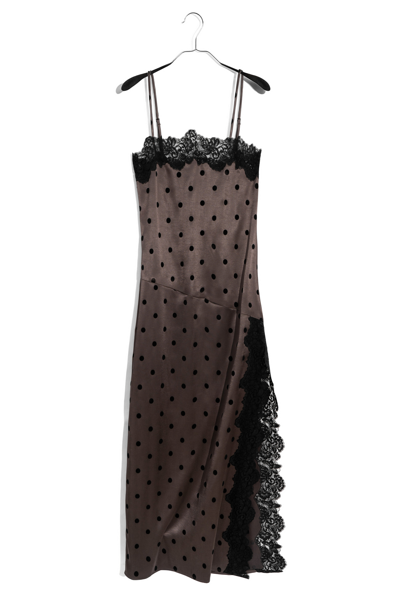 Атласное платье-комбинация длины макси в горох. Модель приталенного силуэта на тонких бретельках и высоким разрезом сбоку. Изделие декорировано кружевом.