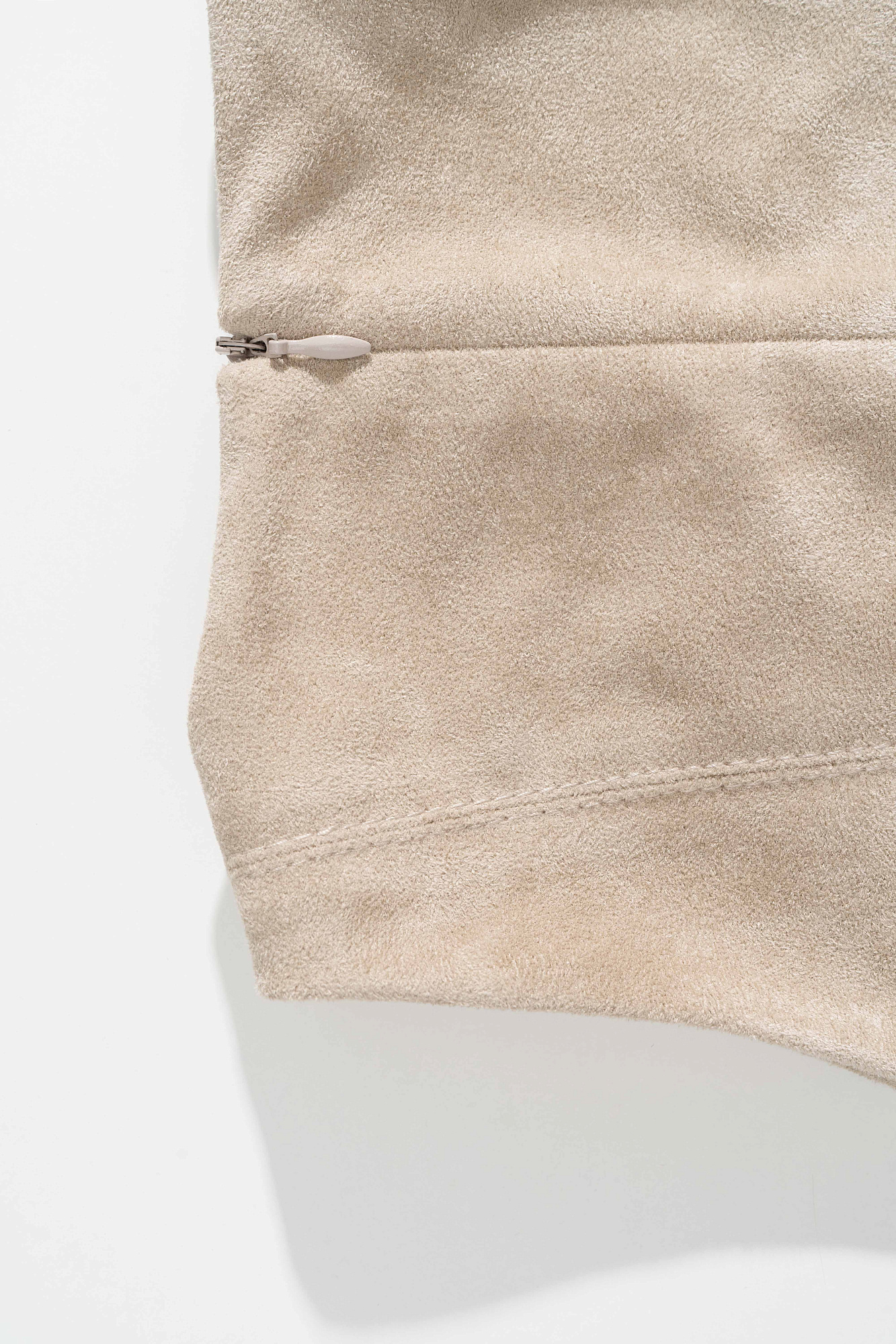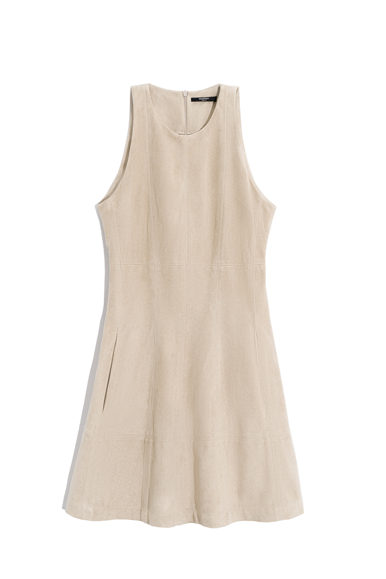Платье длины мини из ткани с имитацией внешнего вида и свойств натуральной замши. Модель приталенного силуэта без рукавов, с круглым вырезом горловины и на широких бретельках. Застежка на молнию на спинке. Врезные карманы.