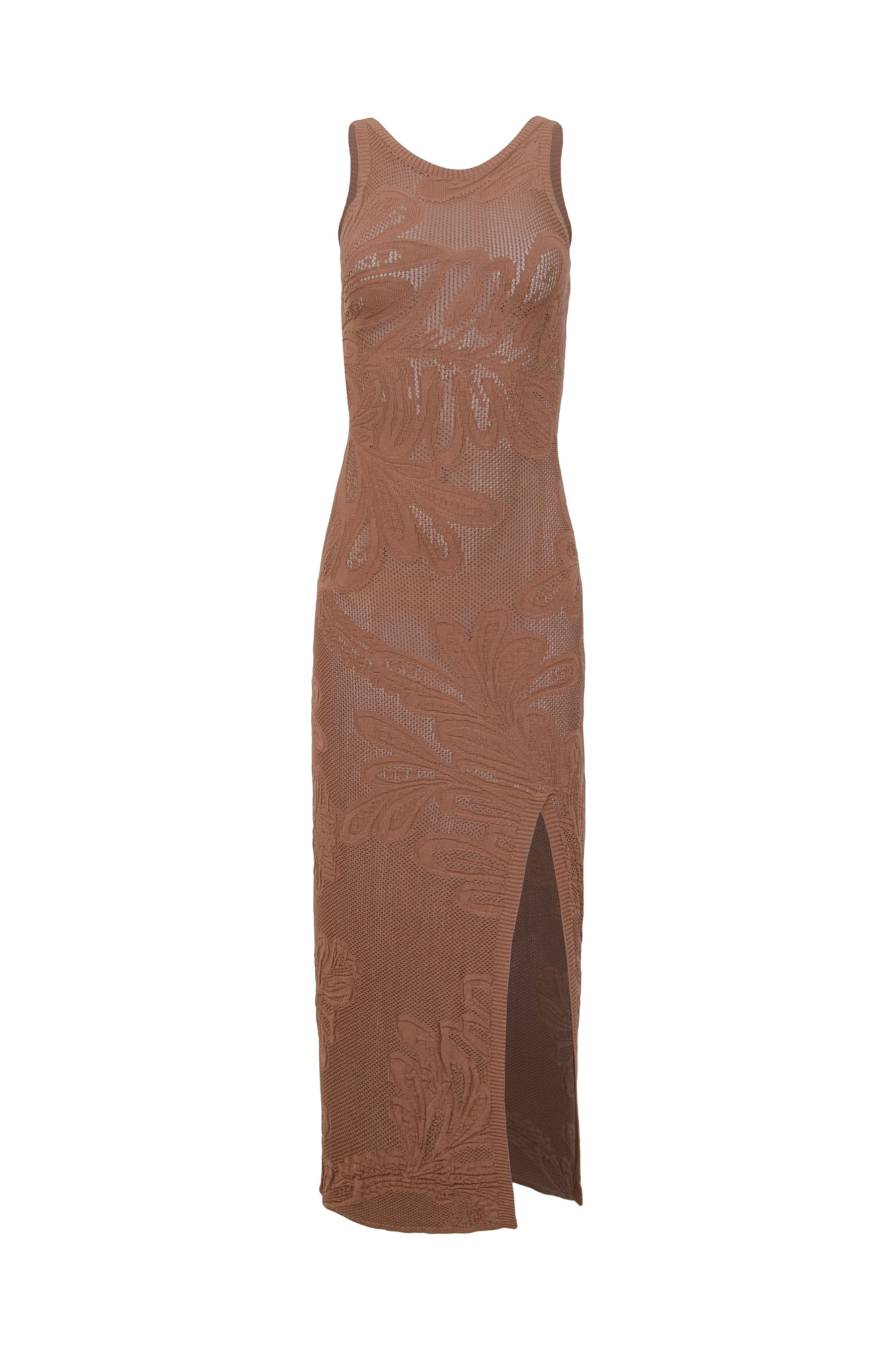 Трикотажное платье длины миди из органического хлопка. Модель приталенного силуэта, без рукавов. круглым вырезом горловины, разрезом спереди и шнуровкой на спине. Изделие декорировано растительным орнаментом.