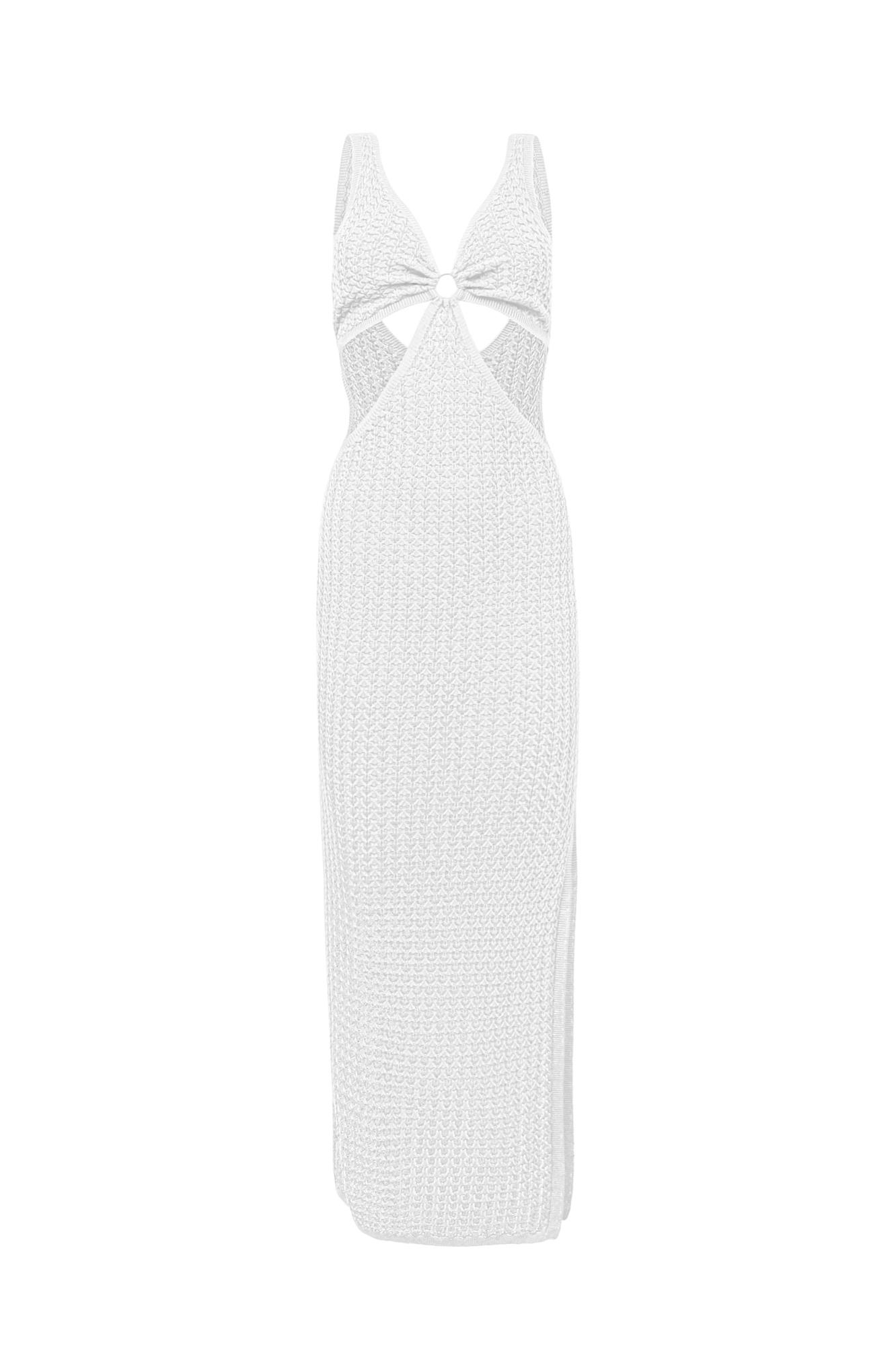 Трикотажное платье из вискозы с разрезом сбоку, кольцом на груди и открытой спиной.