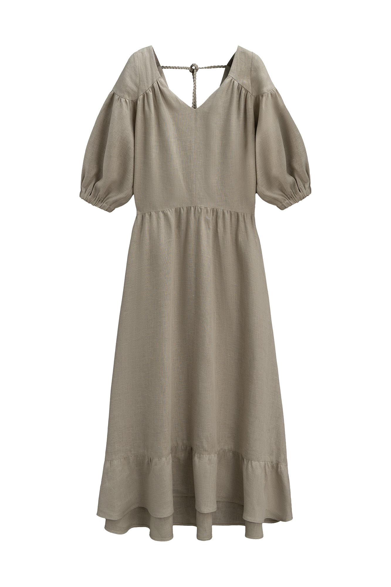 Длинное платье из 100% льна с расклешением от талии и широким асимметричным воланом внизу. Короткий рукав на резинке. V-образный вырез с завязками на спине.