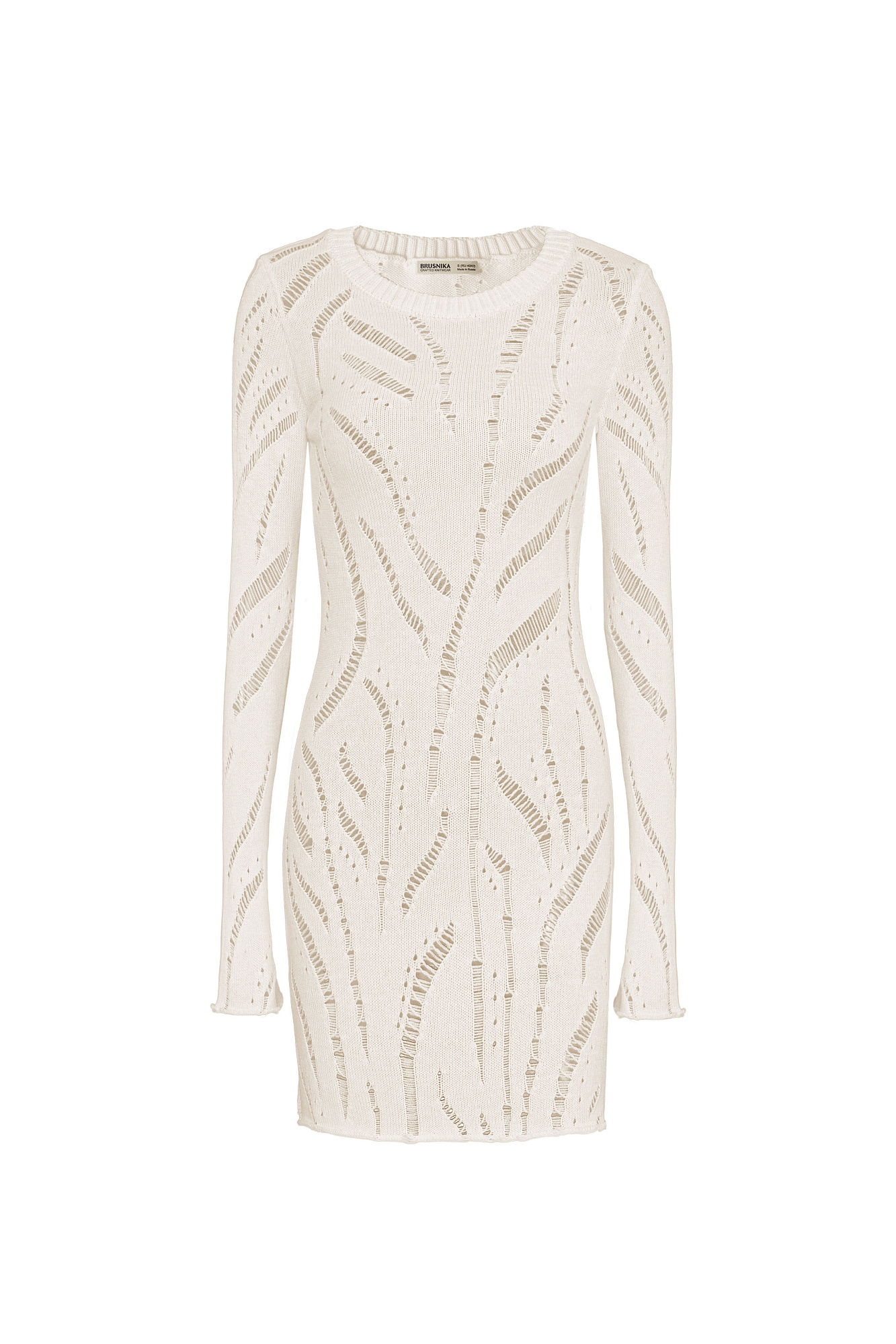 Облегающее трикотажное платье мини с расклешенными рукавами и ажурным узором на основе 100% хлопка. Край изделия выполнен с имитацией закручивания.