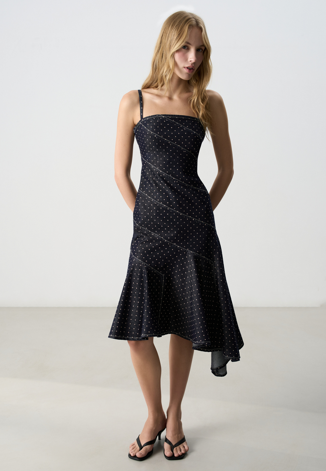 Джинсовый сарафан из хлопка в горошек. Модель приталенного силуэта, без рукавов, на тонких бретельках. Изделие декорировано косой строчкой контрастного цвета и асимметричной юбкой.