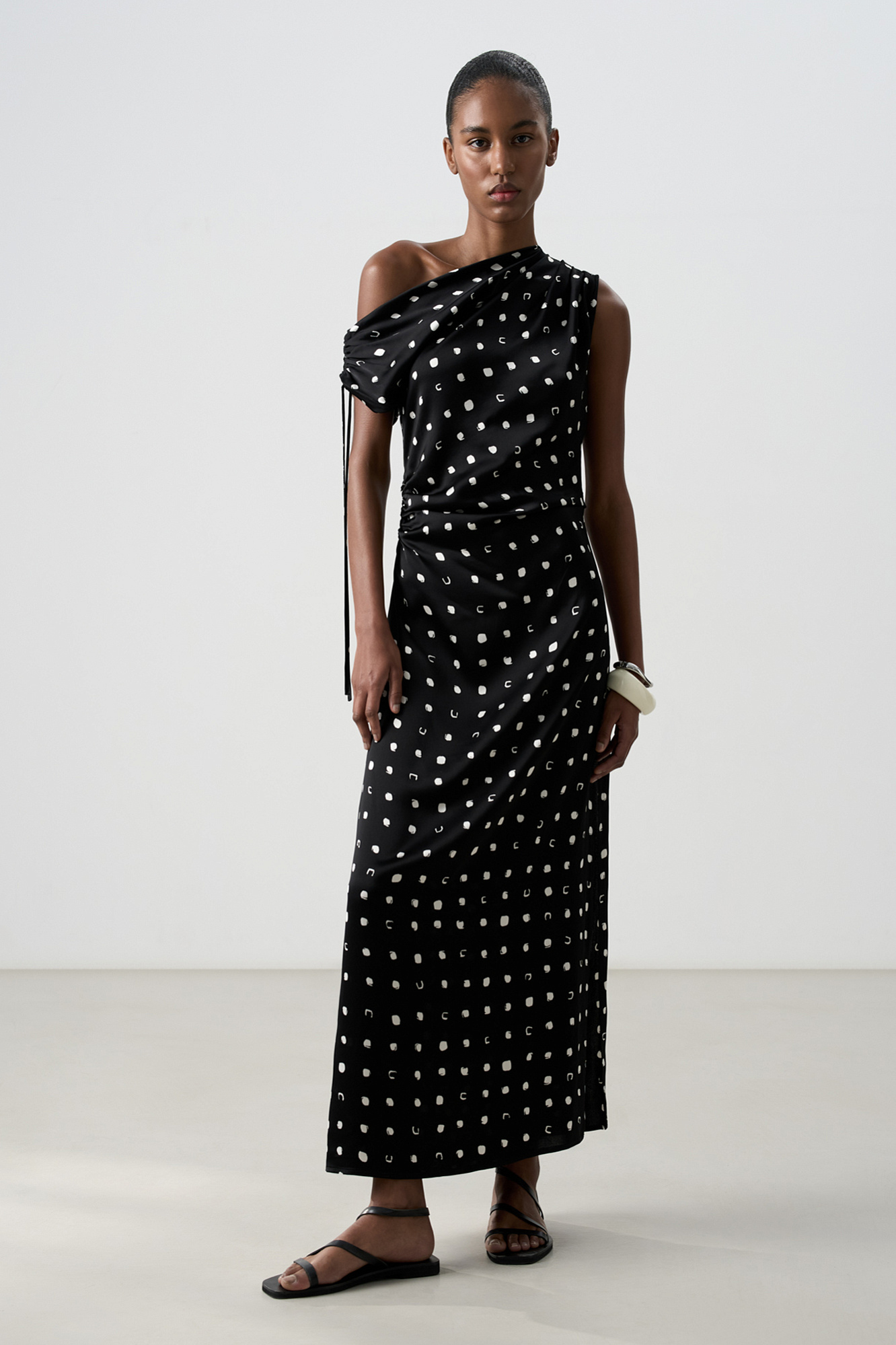 Принтованное платье длины макси из атласной вискозы. Модель приталенного силуэта, с ассиметричным вырезом, драпировкой и кулиской на плече.