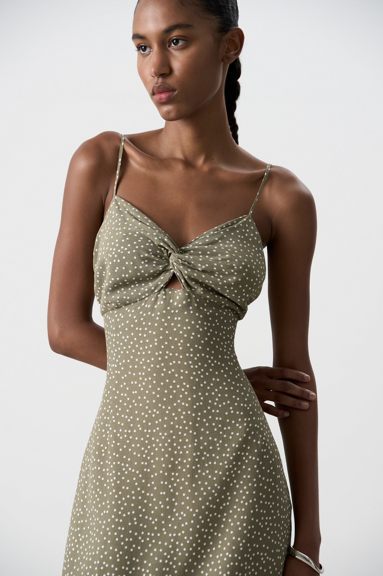 Сарафан из 100% вискозы длины миди, с принтом. Модель приталенного силуэта, на тонких бретельках, с глубоким вырезом декольте, карманами, драпировкой и перекрутом на лифе. Спинка изделия выполнена на эластичной резинке.