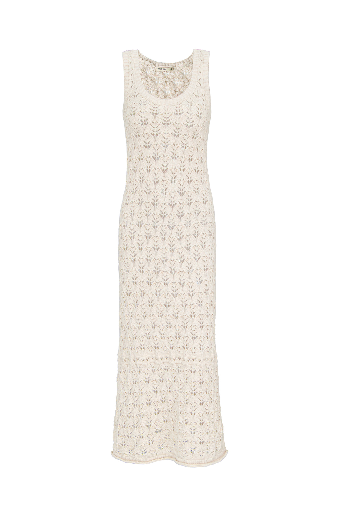 Облегающий ажурный сарафан из 100% хлопка. Модель с круглым вырезом горловины и небольшим расклешением юбки к низу. Изделие декорировано валиком с эффектом закручивания по краю подола. Края пройм и горловина выполнены в рубчик.