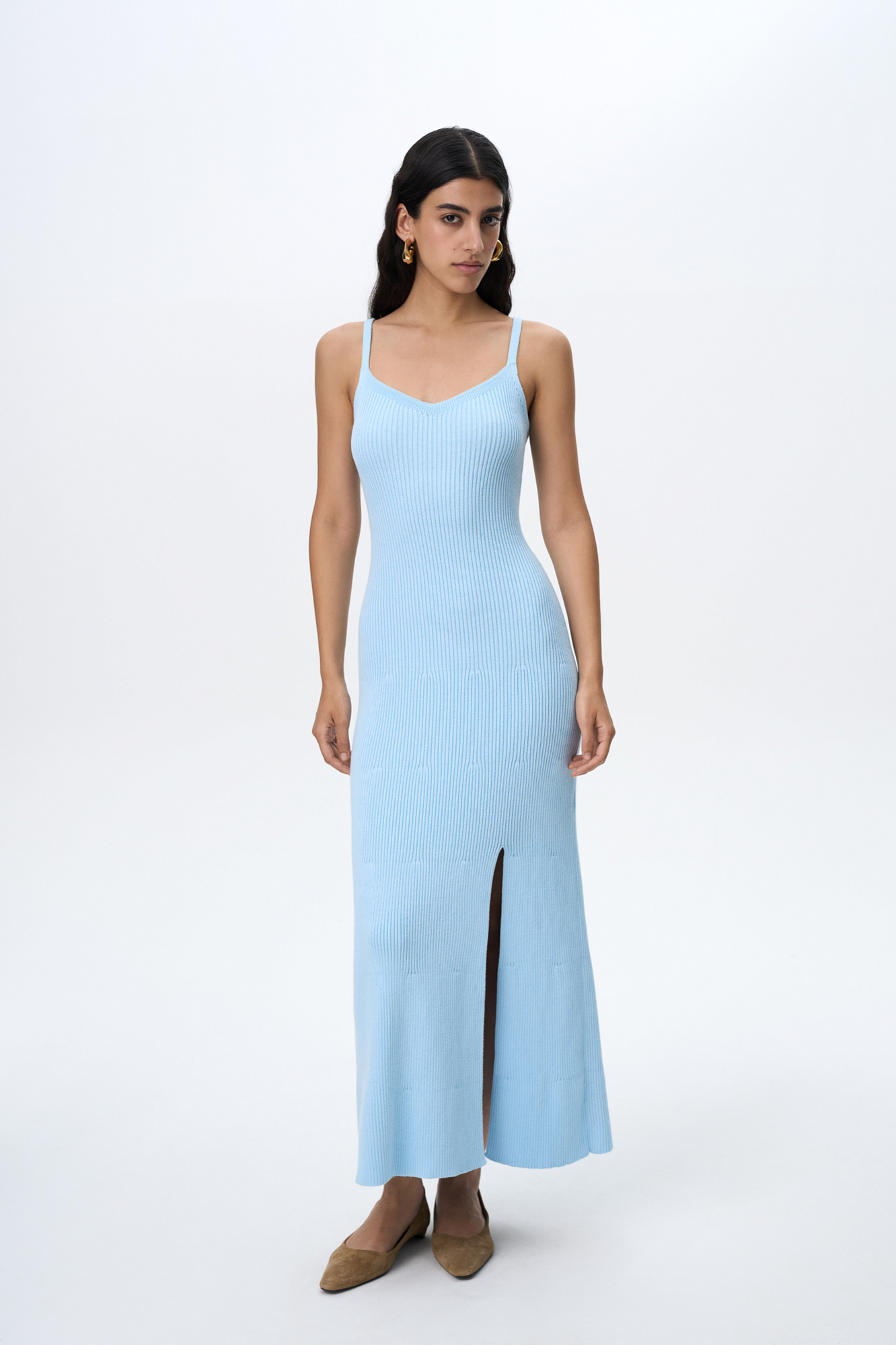 Трикотажный сарафан из 100% хлопка. Модель приталенного силуэта с разрезом сбоку и шнуровкой на спине.