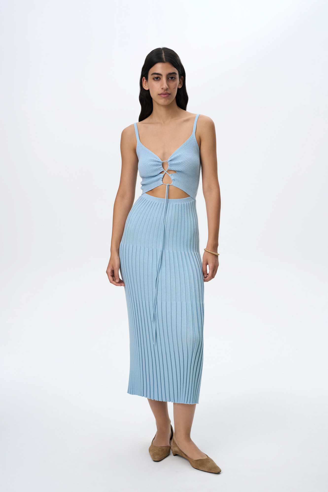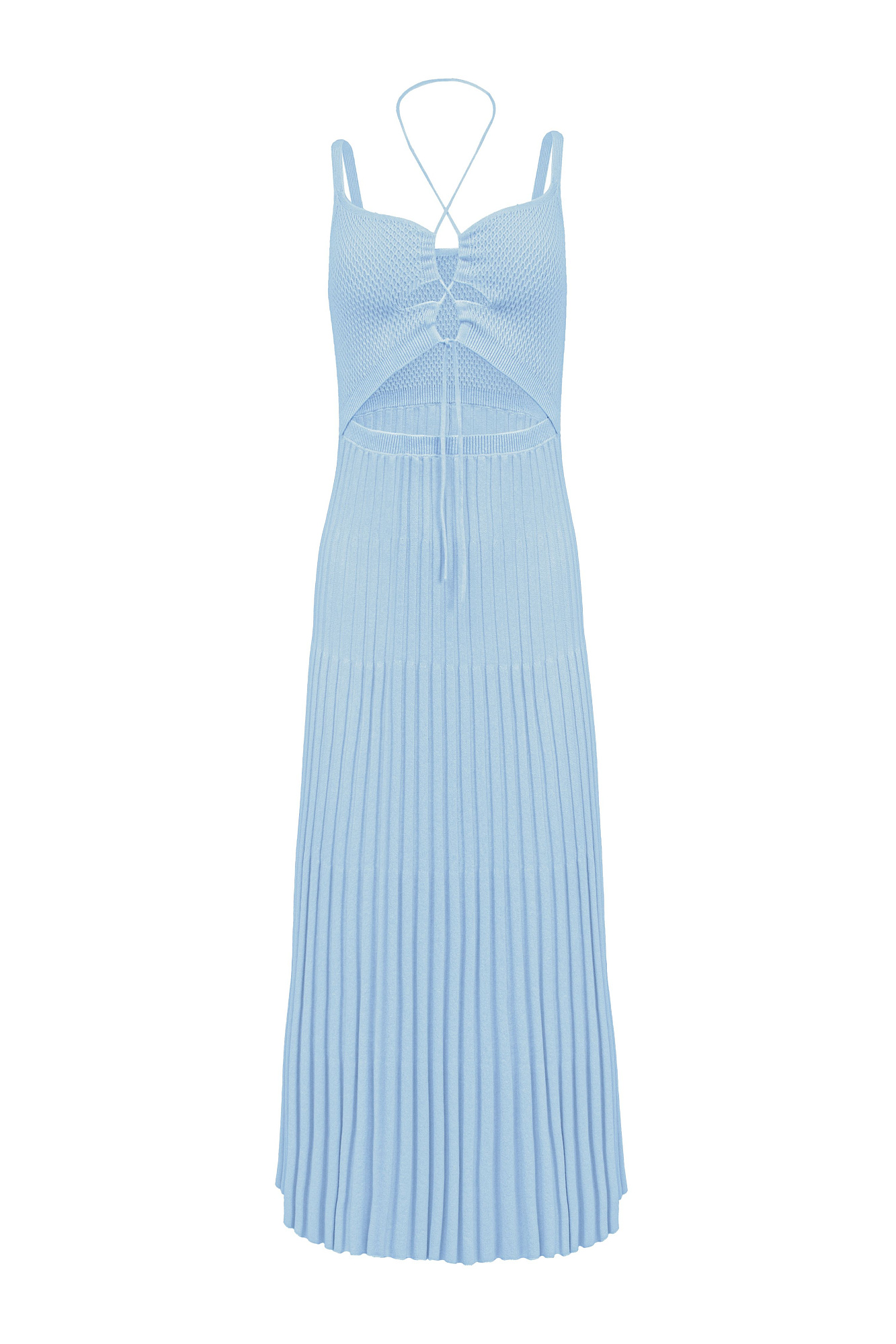 Трикотажный сарафан с юбкой плиссе длины миди из хлопка. Модель на тонких бретелях и шнуровкой на лифе.