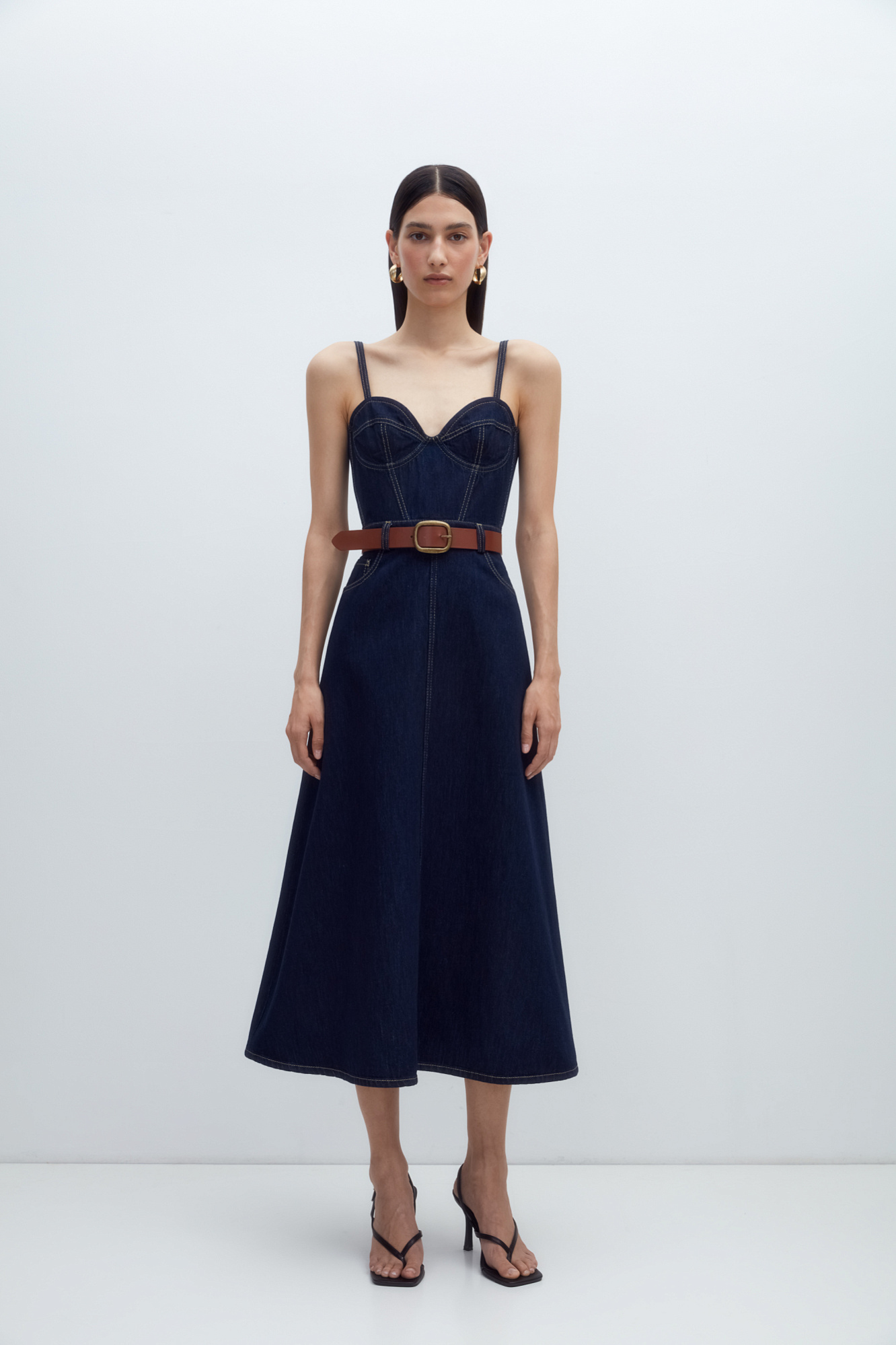 Джинсовый сарафан из 100% хлопка на тонких бретелях, накладными карманами сзади застежкой на молнию.