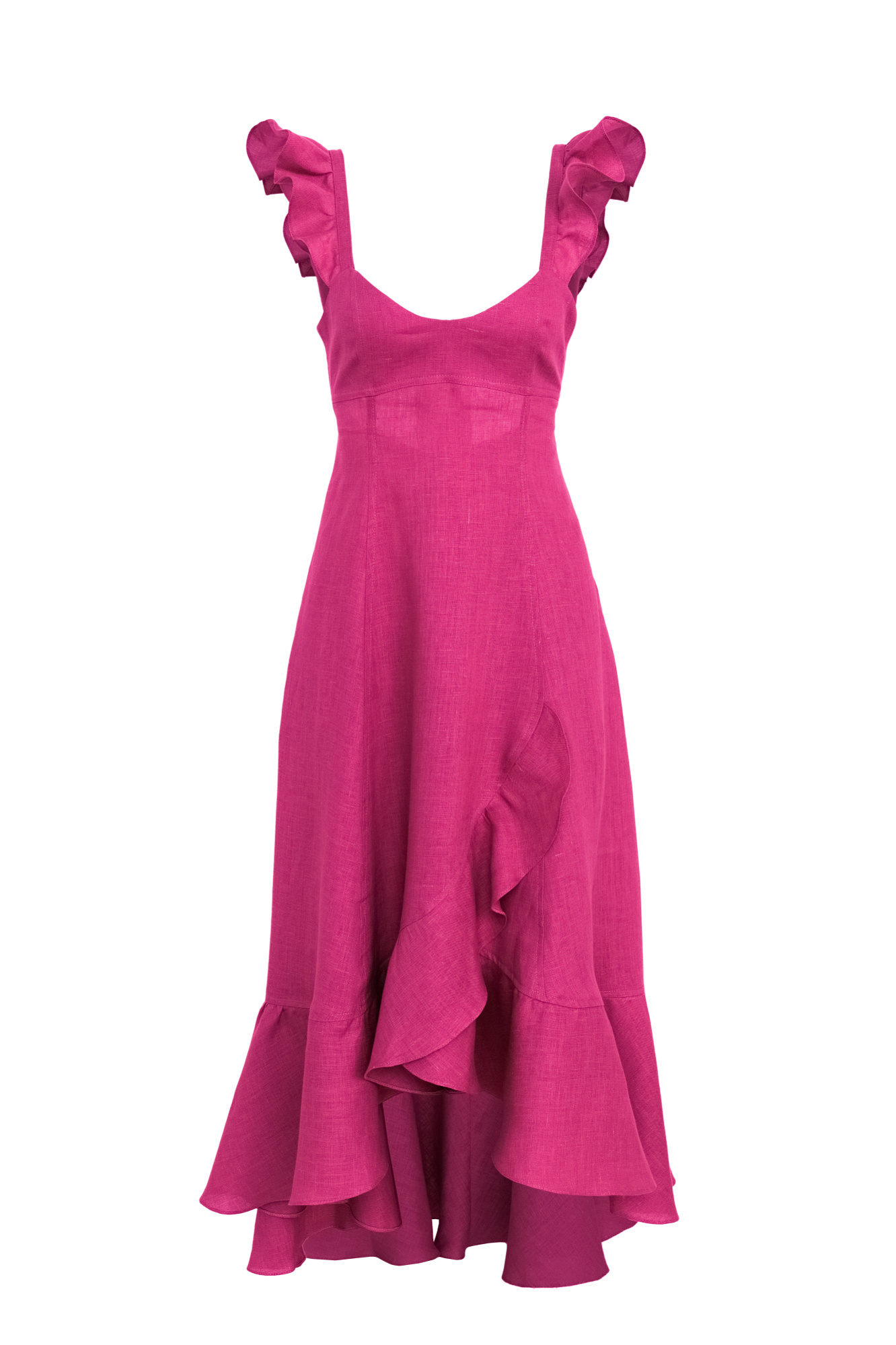 Сарафан длины миди из 100% льна. Модель без рукавов на широкиз лямках с оборками, открытой спиной, асимметричным низом и воланами на юбке.