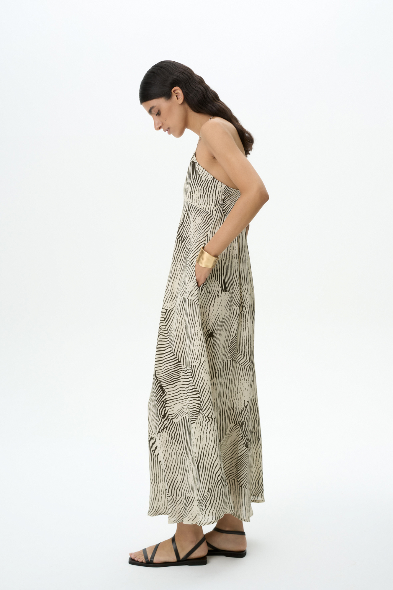 Принтованный сарафан из 100% вискозы. Модель свободного силуэта, с глубоким вырезом декольте и треугольным лифом на тонких бретелях.